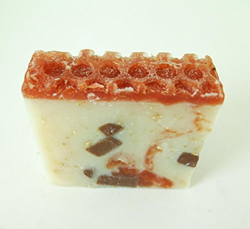 Renegada Honey is a honey and bitter almond scented bar with honeycombed shaped top. Ingredients include: Purified water, saponified oils of organic olive, organic coconut, palm, shea butter, select essential and/or fragrance oil, rolled oats, mica.