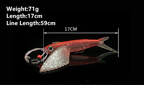 -. Feature : 1.Material: PVC / 2.Color: Blue/Red / 3.Red-17 cm/6.9 in - 71 g/2.5 oz ; Blue-21 cm/8.27 in - 136 g/4.79 oz / 4.Soft Flying Flyer Fish Lure with Hook .