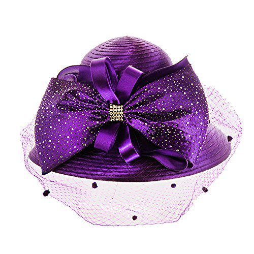 Product Description? Color : Purple ? Theme : Bow ? Crown Circumference : 23" ? Crown Height : 5" ? Brim Width : 4" ? Material : 100% Polyester ? Large Bow on Front Netting Satin Braid Hat0