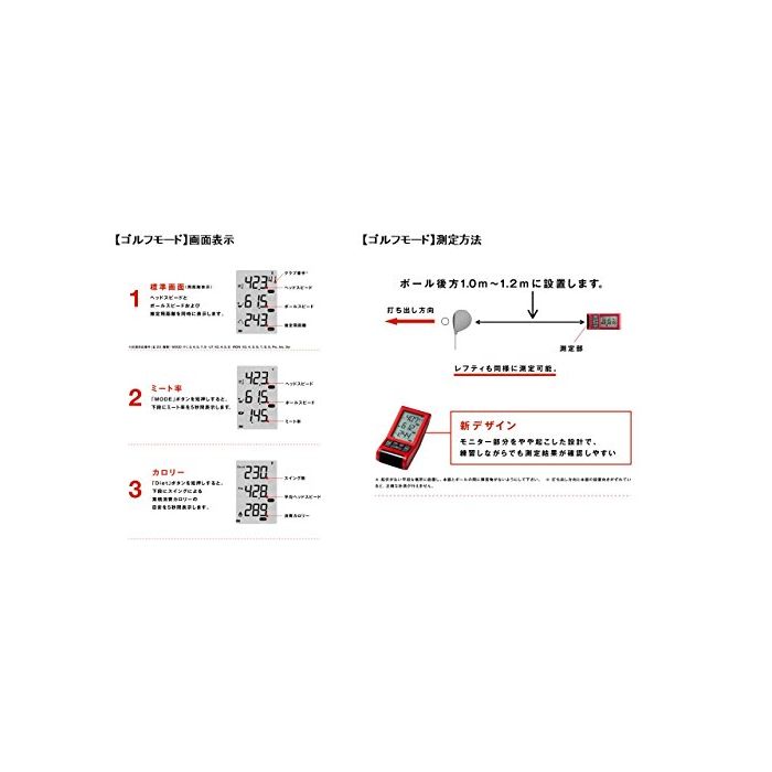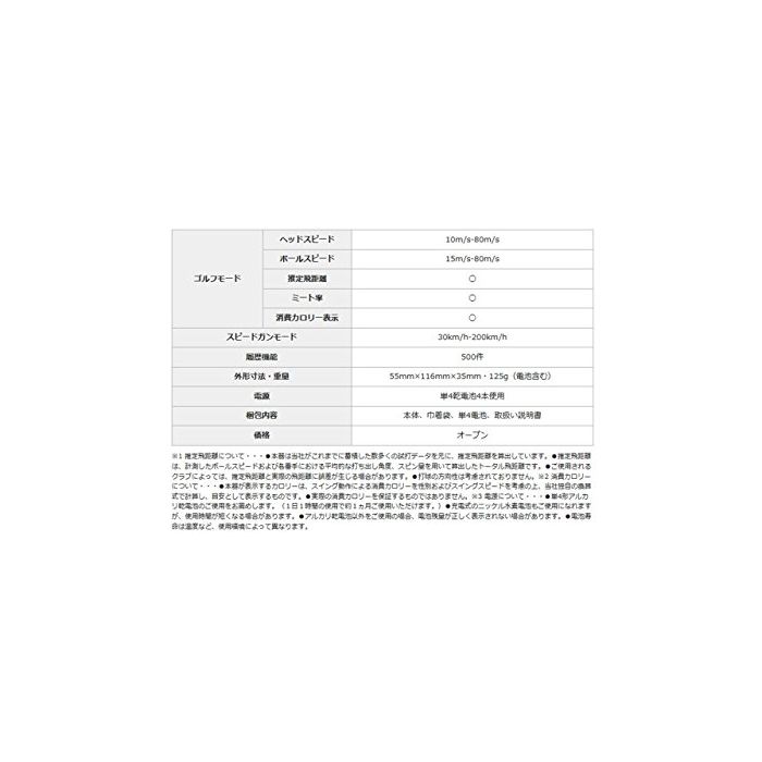 스피드 측정기「RED EYES POCKET」가 새로워졌습니다!골프의 외에,야구,축구로도 사용 할 수 있는【골프 모드 사양】■헤드 스피드:10m/s-80m/s■볼 스피드:15m/s-80m/s■추정 비거리:○■미토율:○■소비 칼로리 표시:○【본체 사양】■스피드 건 모드:30km/h-200km/h■이력 기능:500건■외형 치수:55mm×116mm×35mm■중량:125g(전지 포함한다)■전원:단4건전지4개 사용■포장 내용:본체,건착대,단4전지,취급 설명서