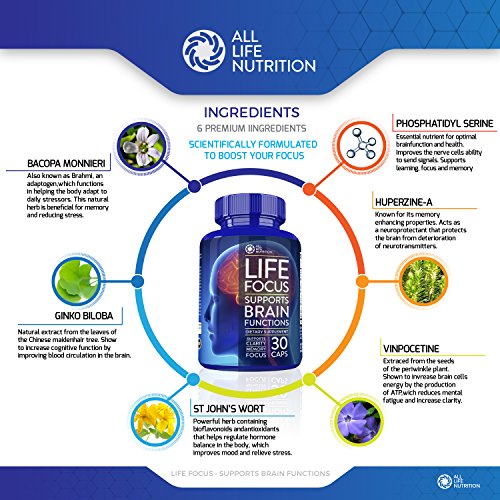 Tired of feeling mentally drained? Feeling stressed out from work or home life? Want a product that can help clear your mind and help you with your productivity? Here at ALL LIFE NUTRITION, we have just what you're looking for! All Life Nutrition's 'Life Focus' is a combination of highly effective natural ingredients that help to target the issues of 'brain fog' and difficulties with concentration. Our supplement includes Ginkgo biloba Leaf extract, which has been proven to increase blood circulation in the brain and to help minimise the risk of Dementia and Alzheimer's. St. John's Wort is a powerful herb that has long been used to help combat issues such as depression, symptoms of PMS, menopause and has even been shown to combat inflammation. This supplement's ingredients have been created in the exact quantities and combination to adequately accomplish its objective of increased alertness and better mental performance. We consider this is as close to a 'limitless pill' as you can find in a natural and safe form. We put 100% into satisfying each and every new and loyal customer! So, what are you waiting for? Invest in yourself! Click on the 'add to cart' button while supplies last! 0 |