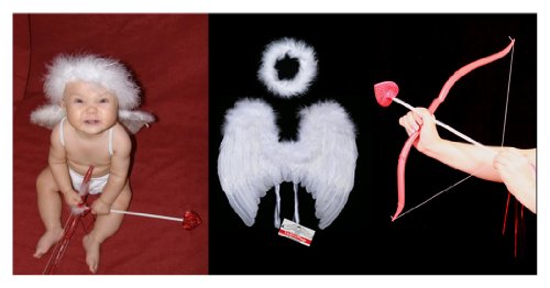 Red Bow approximate length is 18 inches White Arrow approximate length is 12 inches, with soft red heart-shape felt tip Molded plastic, feather & tinsel decors. Feather wings best fit 6-18 month babies Natural feather & marabou, hand made Bleached white