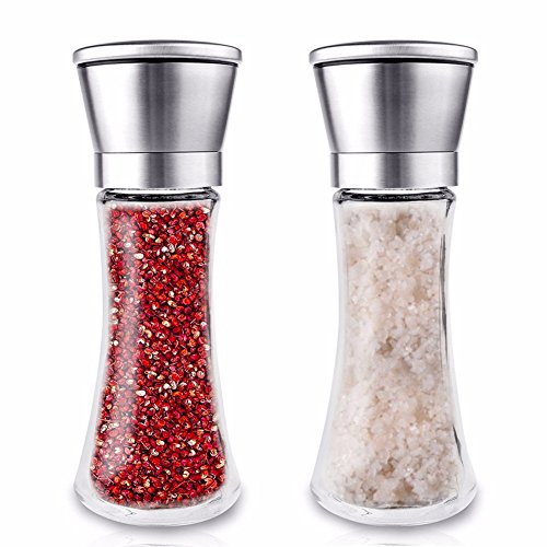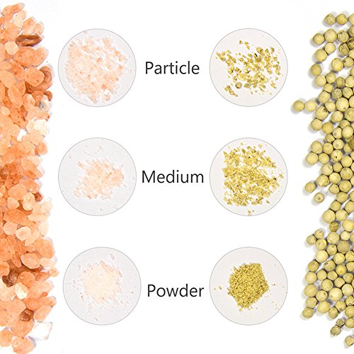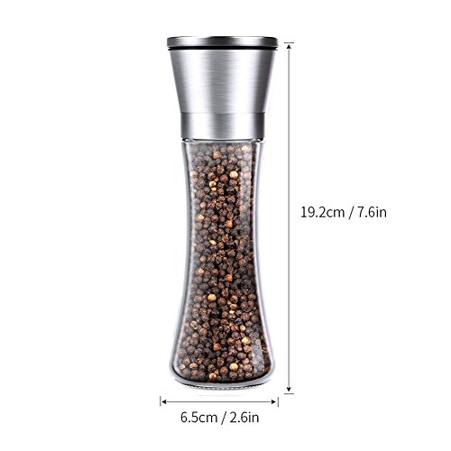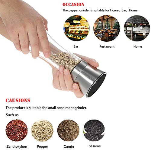 ★ Features 1.Made of durable stainless steel and strong clear glass. 2.Adjustable rotor with five grinding levels from fine to coarse. 3.Suitable for other seasoning such as peppercorn, sea salt, Himalayan salt and so on. 4.Maintaining the flavor and preventing from becoming soggy and clumpy.