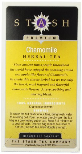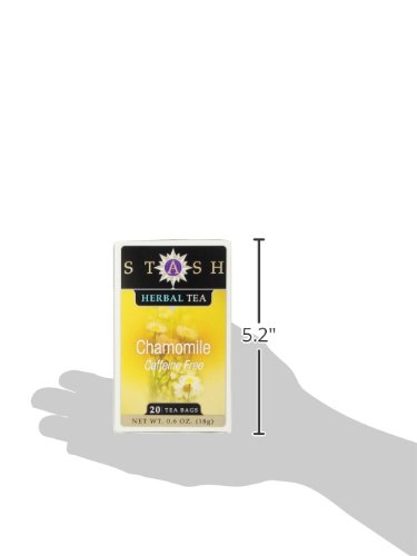 -. Binding : Grocery -. Brand : Stash Tea -. EAN : 0077652082210 -. Feature : Naturally caffeine free / Makes for the perfect start to the morning or afternoon warmup / Brews a beautiful golden cup with a delicate, classic apple-like flavor and fragrance -.Chamomile is known to be a pretty flower and an ancient healer -.Naturally caffeine free -.Makes for the perfect start to the morning or afternoon warmup -.Blended in the USA with natural ingredients from around the world. -. Label : The Stash Tea Company -. Manufacturer : The Stash Tea Company -. PackageQuantity : 1 -. ProductGroup : Pantry -. ProductTypeName : GROCERY -. Publisher : The Stash Tea Company -. ReleaseDate : 2014-04-24 -. Studio : The Stash Tea Company -. Title : Stash Chamomile Herbal Tea, 20 Tea Bags -. UPC : 077652082210