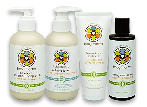 PERFECT BABY GIFT IDEA includes Baby Mantra's Natural 2 in 1 Newborn Shampoo and Body Wash, Calming Lotion, Diaper Rash Ointment Cream, and Calming Massage Oil