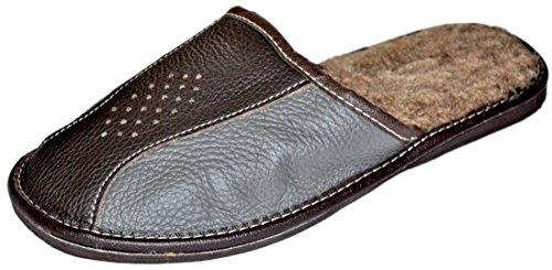 -. Feature : Thick Full grain two layered leather Upper / Fluffy Soft brown Man-made wool lining / Closed-toe design to keep feet warm and cosy during winter / Contrast Stitching / Flexible and durable European design Slippers