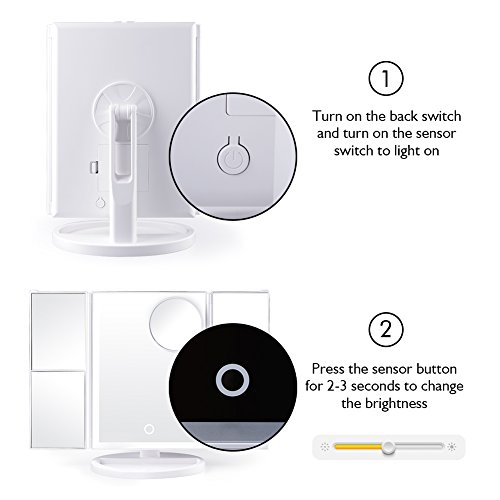 180-degree free rotation: The vanity mirror stands on your countertop can be freely adjusted and fixed,ensuring a perfect and comfortable viewing angle. Tri-fold and detachable design makes you can take it anywhere you go.