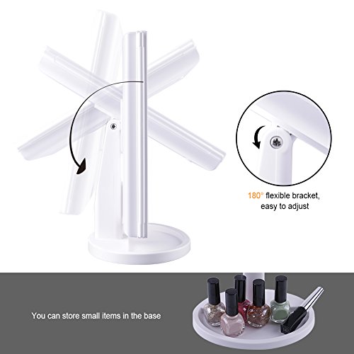 Table Top Mirror:This mirror stands stably by itself on your countertop and can be 180° freely adjusted and fixed ensuring a perfect and comfortable viewing angle. And the Base Recess can hold jewelry or cosmetics like watch, earrings, bracelets, etc. Perfect gift for ladies and girls.