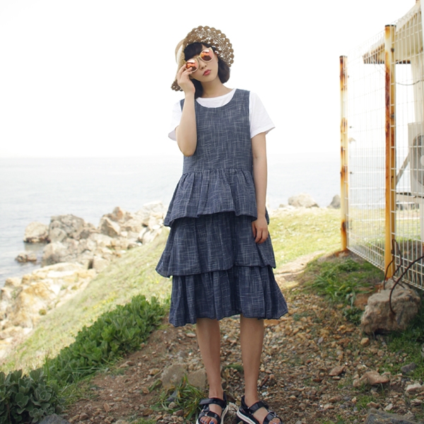 3단 셔링 캉캉으로 로맨틱한 분위기가 물씬 묻어나는 원피스. 시원하게 민소매 원피스혹은 앞머리소녀처럼 셔츠 혹은 블라우스등 다양한 레이어드가 가능해 사계절 사랑받는 원피스