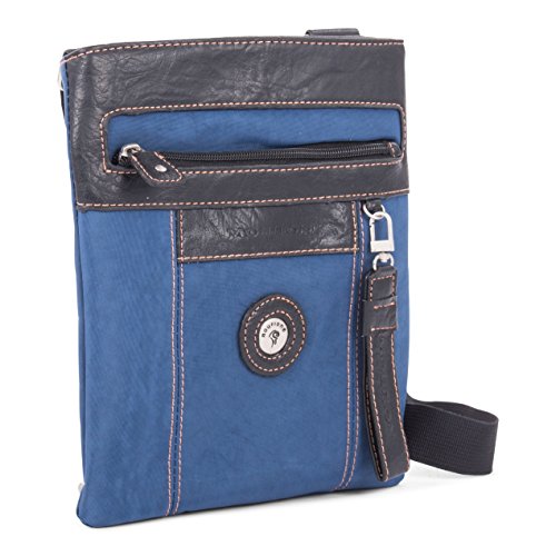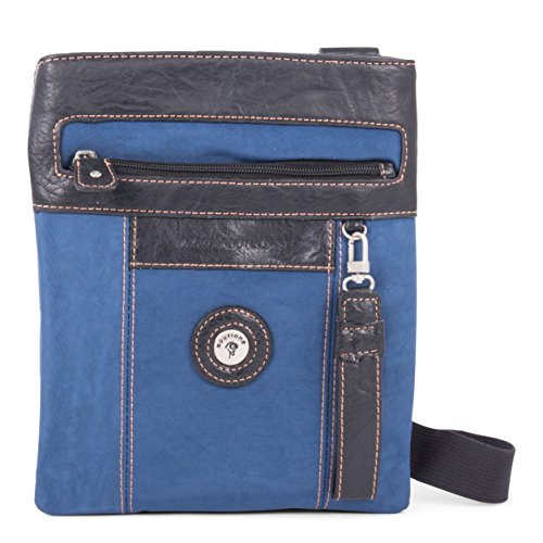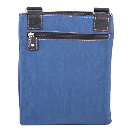 Studio : Bugatti Publisher : Bugatti Product Description Secure your valuables in this vertical messenger bag. The crossbody design keeps it close, preventing theft. Front and back zip pockets make it easy to stash small items. Type: Basic, Lightweight Material: Nylon Pattern: Solid Exterior Pocket: 1 Interior Pocket: 2 Feature: Adjustable Strap Exact Color: Blue Color: Blue, BlackMeasurement Guide 0