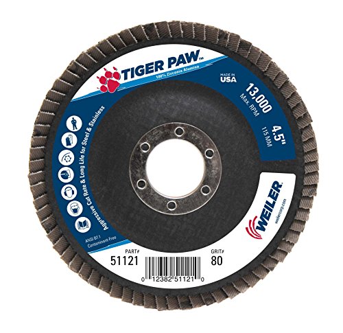 Weiler 51121 Tiger Paw High Performance Abrasive Flap Disc, Type 29 Angled Style, Phenolic Backing, Zirconia Alumina, 4-1/2" Diameter, 7/8" Arbor, 80 Grit, 13000 RPM (Pack of 10)