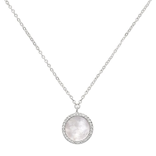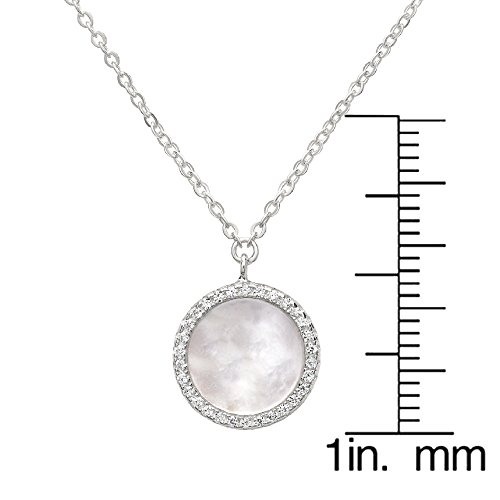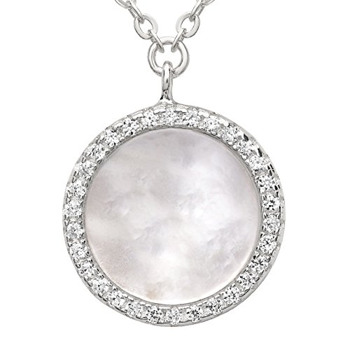 Features a Round Elegant Mother of Pearl surrounded with a pave of cubic zirconias in sterling silver.