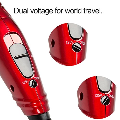 Warning:When you are traveling to Europe or elsewhere the voltage is 220V-250V.You can take the hair dryer with you.And you need remember to change the voltage by switching the voltage converter. Follow the steps: 1.Make sure the dryer is turned off and disconnected from mains supply.2.Slide the speed switch to the low setting.(Make sure the switch is slid to the low setting before you switch the dual voltage converter. DO NOT switch the dual voltage converter at off or high setting,this may damage the hair dryer.)3.Use a small screw to switch the dual voltage converter clockwise to the 250V mark(You may need a plug adaptor of the proper configuration to fit into the local outlet. Note:the hair dryer speed switch must remain in the low position when using 220-250 volts.This is normal for dual-voltage appliances.) To convert back to 125v,just use the screw to switch the dual voltage converter clockwise to the 125V mark1.Professional 1875W DC motor The DC motorprovides lightweight body,low noise features,and the 1875 watts could let your hair down less than 5min.
