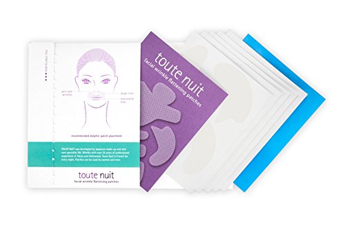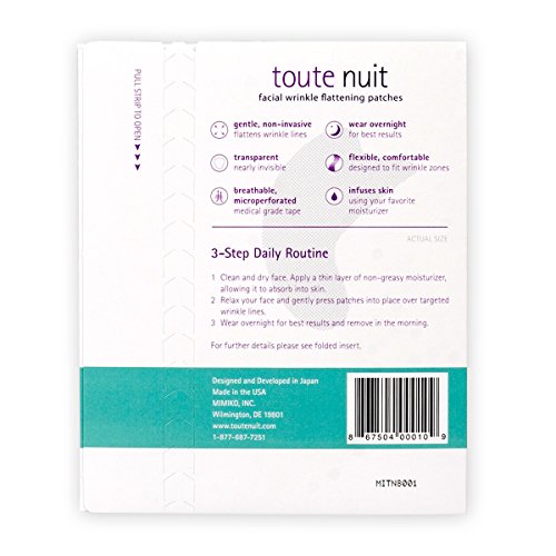 Toute Nuit facial wrinkle flattening patches are a natural, safe, affordable, convenient way to minimize the negative impression of facial wrinkles. Patches fit comfortably over targeted wrinkle zones, allows for natural face movements without falling off. Nearly invisible (and won't disturb your sexy time). The patches relax underlying facial muscles (wrinkles are caused primarily by repetitive movements of facial muscles) to flatten deep set wrinkles and smooth out fine lines with repeated use. They also help prevent and slow down the formation of wrinkle lines. Toute Nuit (Toot New+We) is a French expression that means every night, the ideal time to wear the patches while sleeping. A facial reset every morning! For side sleepers the patches help prevent wrinkles from pillow creases. Patches are made from an odorless transparent medical grade plastic tape, hypo-allergenic with small square perforations, allows for some air porosity. No additives. No latex. It is highly recommend to apply any preferred non-greasy moisturizer on the skin in the targeted wrinkle zone before pressing the patches into place. This helps it from rubbing off or evaporating to infuse it into the skin to increase its efficacy. Patches can be reused 2-3 times; between uses place on provided low friction blue storage sheet. Non-invasive alternative to BOTOX and fillers. Economical, patch shapes can be bought separately to minimize waste. Reduces stress and minimizes facial muscle movements while interacting with tablets or smart phones (relief from small screen squinting syndrome), working on laptop at home or in the office, performing chores around the house and even while driving. The patches provide a sense of relaxation too. Originally designed and developed in Japan by a Japanese make-up artist and skin care specialist Ms. Mimiko with 35 years of professional experience in Tokyo and Hollywood. Toute Nuit is made in the USA and distributed by MIMIKO Inc.Feature