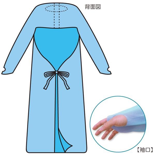 | 袖つきタイプのビニールエプロンです。袖口は親指が引っかけられる形状になっているため、使用中にズレ上がってきません。背面には、脱ぐ際に引っ張って切ることができるスリット入です。 |