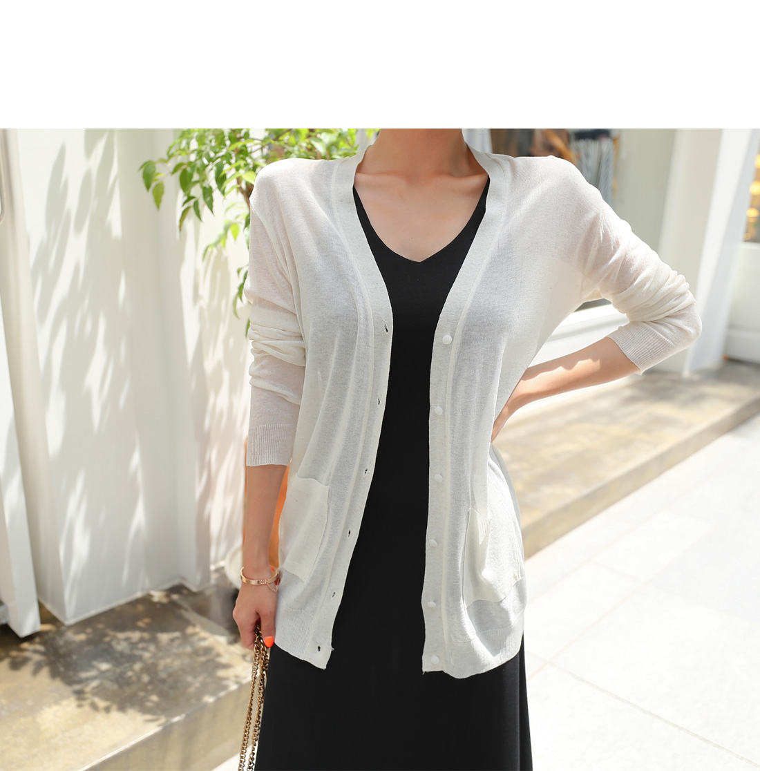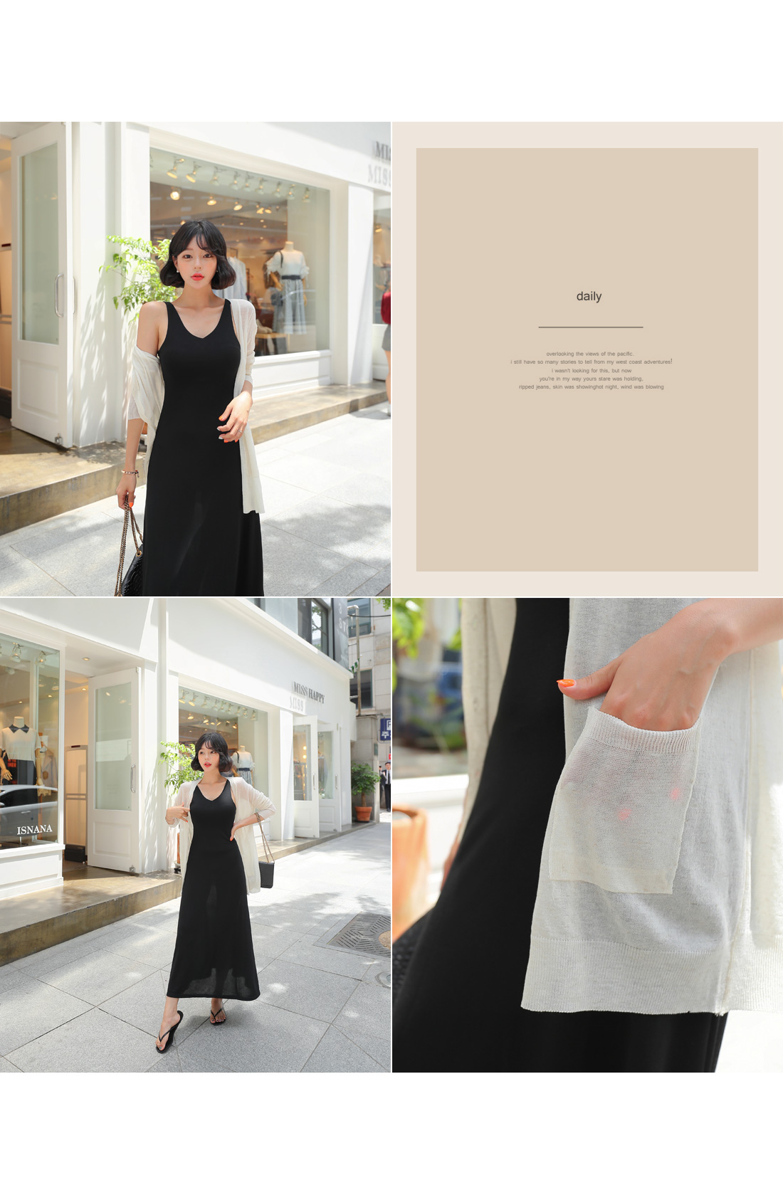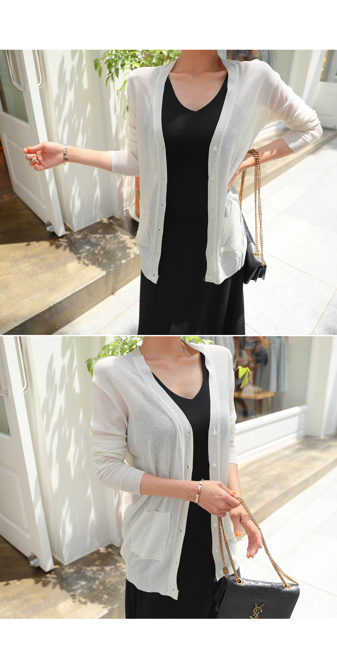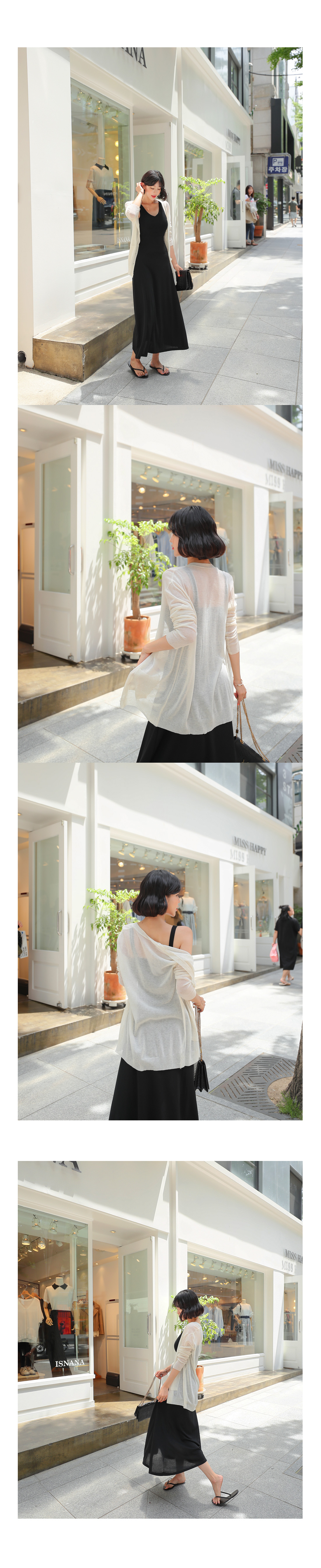 MD COMMENT 힙을 덮어주는 롱 기장의 브이넥 가디건을 소개합니다얇고 가벼운 소재로 제작되어여름에도 시원하고 편하게 입기 좋으며힙을 덮어주는 길이로안정감있는 착용감을 선사해주는 가디건이랍니다.단추 디테일로 오픈, 클로징을 도와주며포켓 디테일이 더해져 밋밋함을 없애주었어요.여성스러운 원피스나 스커트 코디에도 잘 어울리며팬츠와 함께 캐주얼한 느낌으로스타일링해도 예쁘게 잘 어울려데일리하게 즐기기 좋은 아이템이랍니다!COLOR/SIZE 베이지,아이보리,옐로우,스카이블루,블루,라이트핑크,체리핑크,블랙FREEMODEL FITTING 베이지/FREE