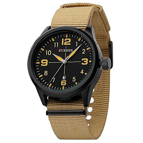 -. Feature : 薄い茶色のキャンバスストラップが付いたブラックメタルケース。固定合金ベゼル。 / 黄色と黄色の手とアラビア数字の時間マーカーと黒のダイヤル。外側リムの周りの細かいマーカー。 6時の位置に日付が表示されます。 / シンプルなラインは、低プロファイルの金属光沢、高硬度のテンパリングされた水晶ミラーに流れます。高度の透明度、アンチグレア / ナイロンキャンバスストラップは、豊富な色の選択の質感と耐摩耗性、密接に厚い。便利な針バックルのデザインはシンプルなスタイルを続けています。 30メートルの防水。 / スポーツウォッチスタイル。 Timeモジュールアナログディスプレイ付きのQuartz(Japan Made)ムーブメント。