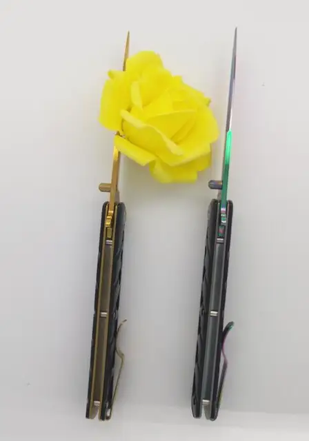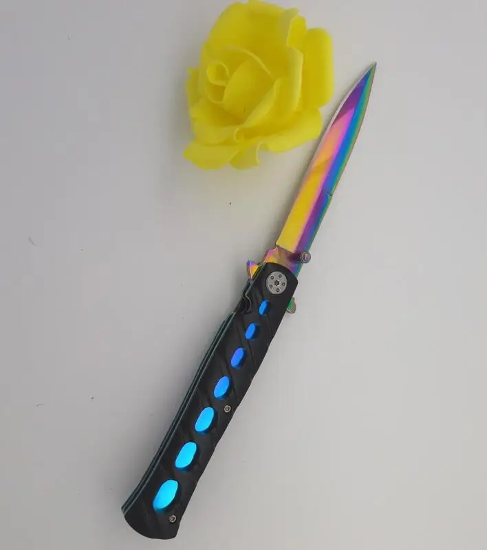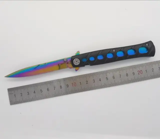 상품 내용 최신 Titanizing 접는 블레이드 나이프 5Cr15 스테인레스 스틸 블레이드 항공 알루미늄 핸들 나이프 야외 캠핑 도구 블레이드 재질: 5Cr15 경도: 57HRC 전체 길이: 220 미리메터 블레이드 길이: 95 미리메터 블레이드 폭: 15 미리메터 (가장넓은부분) 블레이드 두께: 2.9 미리메터 블레이드 표면: titanizing (골드, 무지개) 블레이드 칼집: 나일론 핸들 재질: 항공 알루미늄 무게: 115 그램