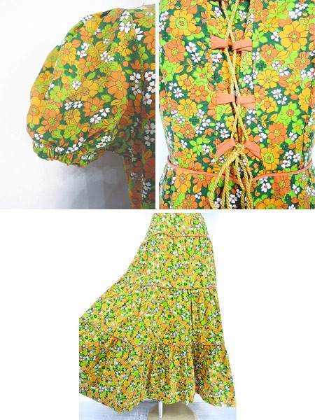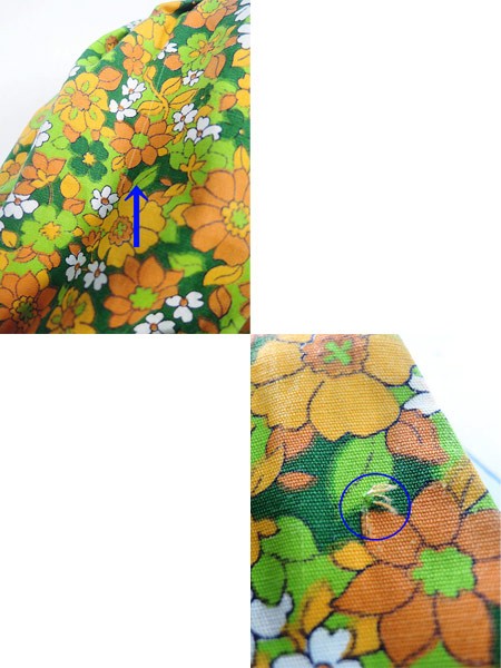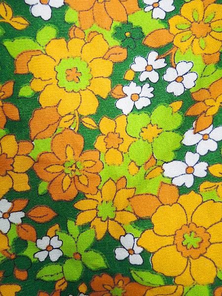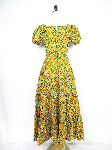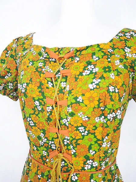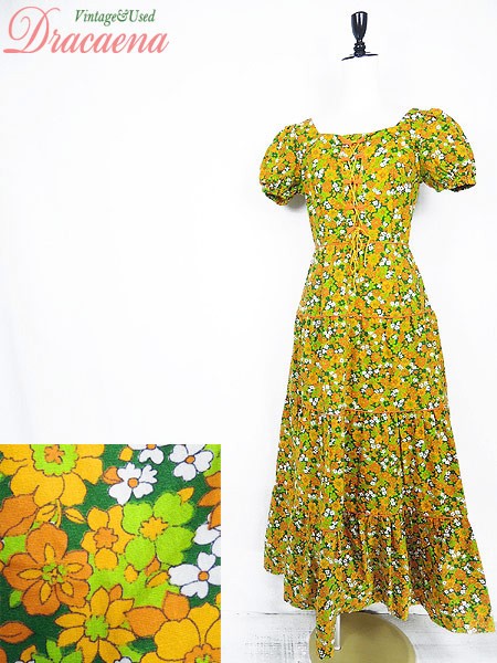 ヴィンテージ、60〜70年代頃のレトロな花柄が可愛いワンピースです。パフスリーブ、パイピングなど全体のアンティークな雰囲気も◎。ハリ感のあるコットン素材、ピンロックジップ仕様。裏地なし。右袖に糸引きあり。