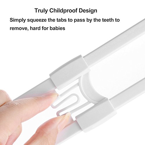 - Easy to install and unlock: the sliding cabinet door locks work with the teeth and groove method, no tools or drilling required, simply squeeze the tabs to pass by the teeth to remove, insert around knobs or handles and slide the piece together
