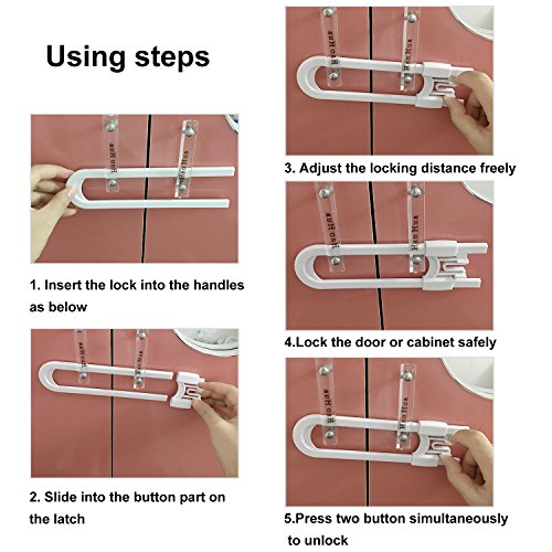 - Adjustable length: adjustable childproof cabinet latch with an extra-long U-shaped latch, can be adjusted to suit for diverse knobs or handles with distance up to 5 inches