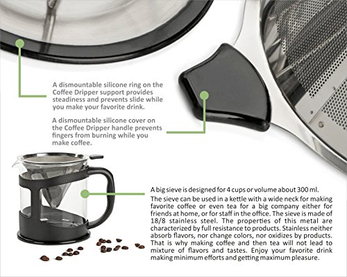 -. Feature : - SAVE THE FLAVORS AND OILS - While paper filters subtract essential flavors, our stainless steel mesh filters will maintain all the aromas for an ideal brew! / - DURABLE HEAT-RESISTANT HANDLE - Our unique silicon pad design prevents the handle from getting too hot and burning your fingers! / - UNIVERSAL FIT - Standard sized base that will fit most mugs, cups, tea pots, carafes, & thermoses. Perfect for the home or office. Makes a great gift! / - PORTABLE AND HANDY DESIGN - Extremely convenient self standing base. Pour over your cup then easily empty and rinse your filter to use later! / - 100% SATISFACTION GUARANTEED - If you are not absolutely satisfied with your Coffee Dripper, simply send it back for a refund. NO QUESTIONS ASKED!
