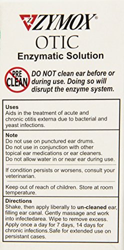 ZYMOX Otic is used in dogs and cats for the treatment of acute and chronic inflammation of the external ear caused by bacterial, viral and yeast infections. Treat once a day for 7 days for acute infection and once a day for 14 days for chronic infection. Do not use in conjunction with other topical ear medications or cleaners.Feature