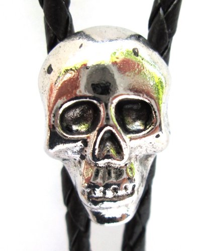 - Classic Western Bolo Tie with silver colored Cast Pewter Skull on woven leatherette cord.