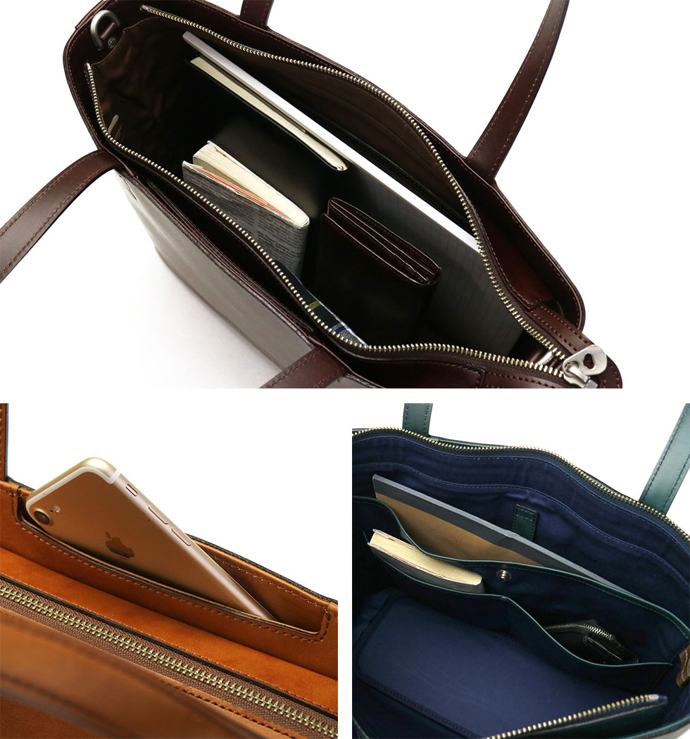 The main room is compatible with A4 size, and inside pocket is enriched with fine sorting. Awaori pocket provided on the outside is useful for putting things you want to take out immediately such as smartphone and pass case.
