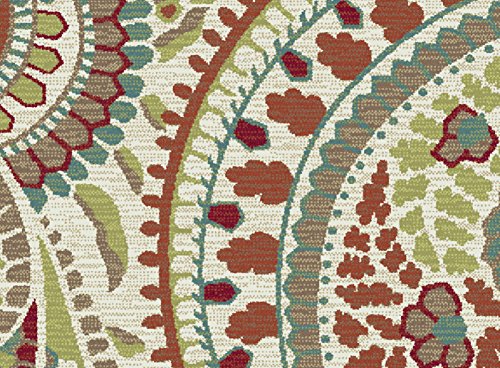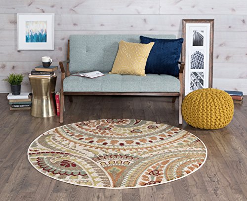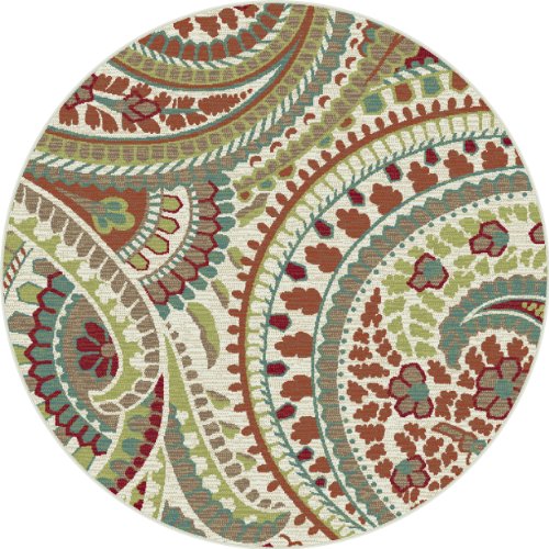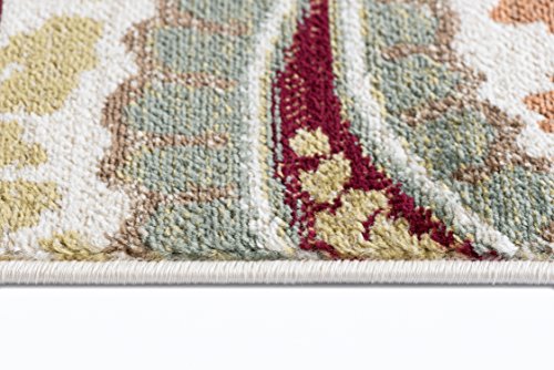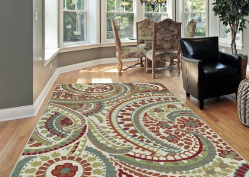 Stylish paisley pattern with a lively appeal. This transitional area rug is versatile enough to span a variety of decors. Options include rounds and a three piece set for a coordinated look throughout the home. Snowy ivory background with teal blue, pear green, cranberry red, russet, ecru gold, mushroom taupe, and espresso brown. Machine made of soft polypropylene that is naturally stain-resistant and easy to maintain. Vacuum often on high-pile setting and spot clean when necessary using mild detergent but no bleach.Feature
