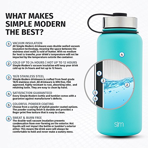 VACUUM INSULATED - The Simple Modern Summit water bottle is double-walled and vacuum insulated. This technology will keep you drink cold for up to 24 hours or hot up to 8 hours. This wide mouth reusable bottle will never sweat.