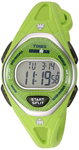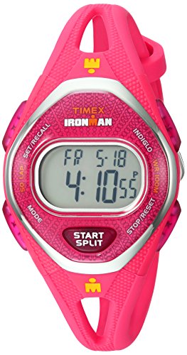 Designed for comfort, style and performance, this midsize digital sport watch combines our softest ever silicone strap with easy access to the stopwatch, timers, alarms and our signature Indiglo night-light. This women's Timex Ironman Sleek 50 mid-size watch features a white silicone strap, a white resin case with dark gray pushers, a silver-tone top-ring, and an easy-to-read gray digital display. This watch is water resistant to 100 meters (300 feet).Feature