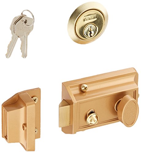 Auto locking latch with deadbolt security feature. Painted in bronze. Single cylinder latch is operated with a key from the exterior of the home and a thumb turn from the interior.