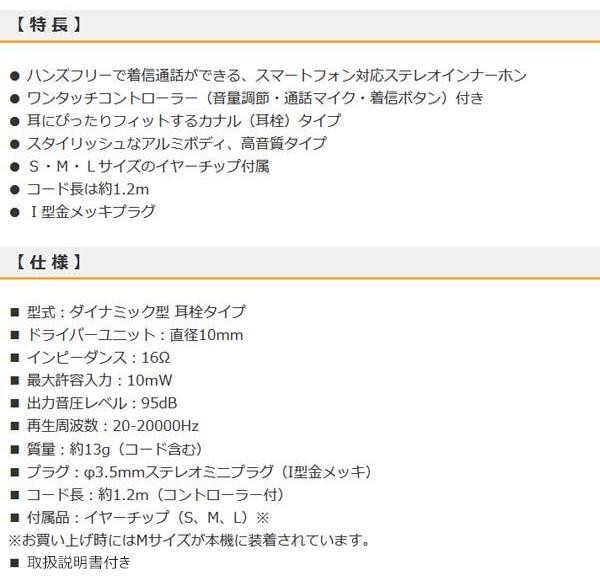 ハンズフリーで着信通話ができる、スマートフォン対応ステレオインナーホンです。
