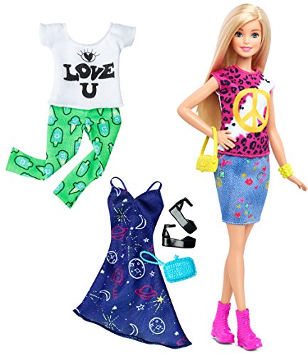 Barbie Fashionistas doll wears a stylish pink and black animal print t-shirt with peace sign graphic and denim skirt with heart and rainbow graphics