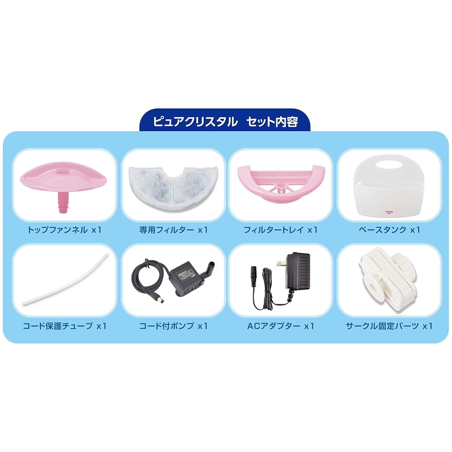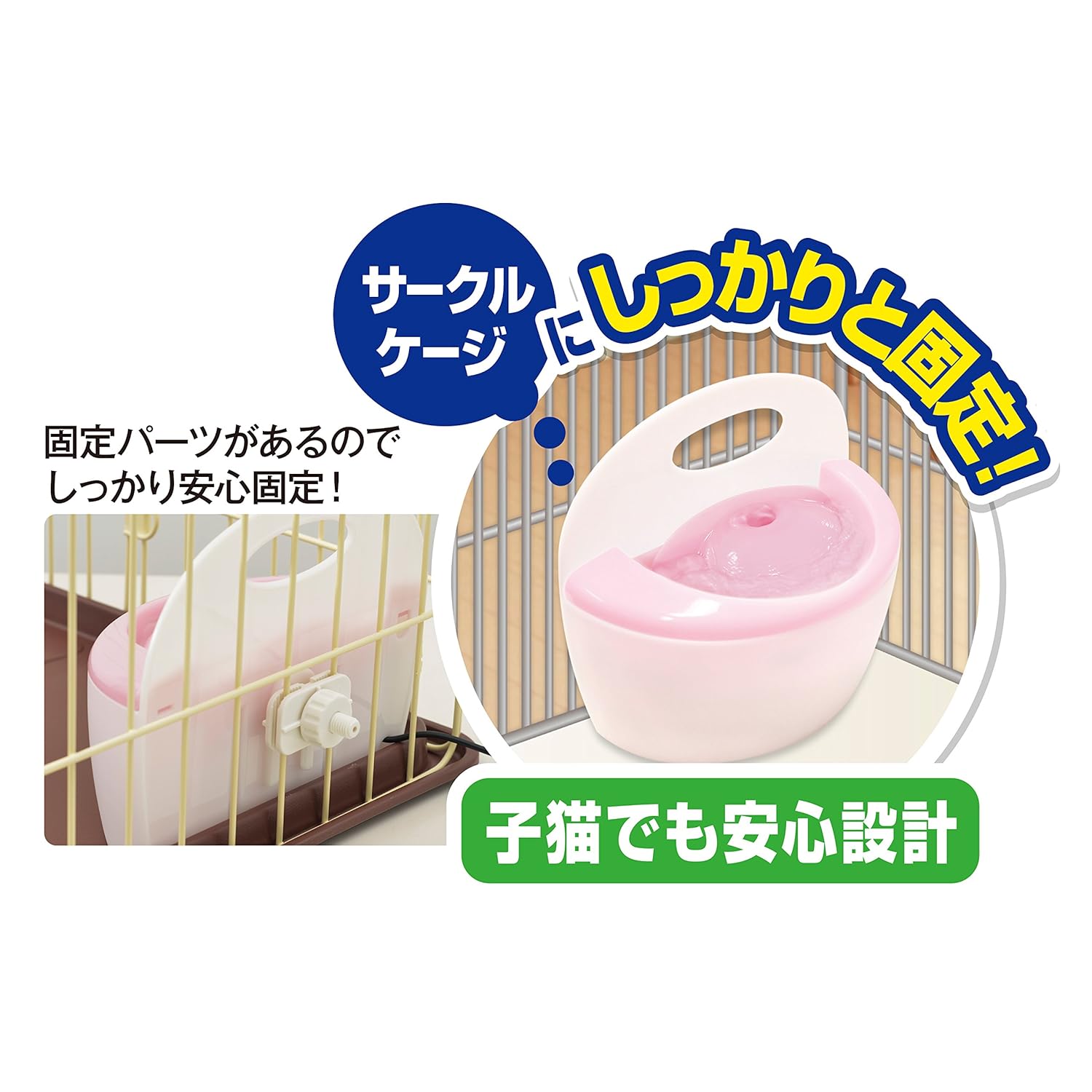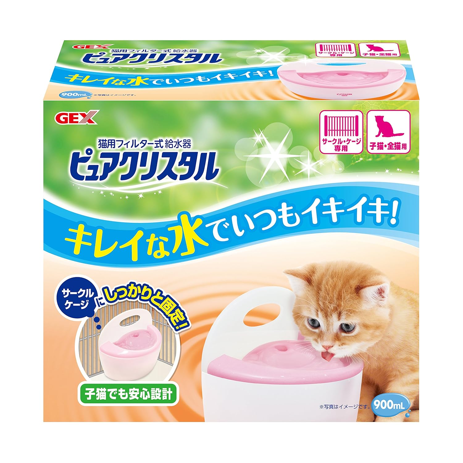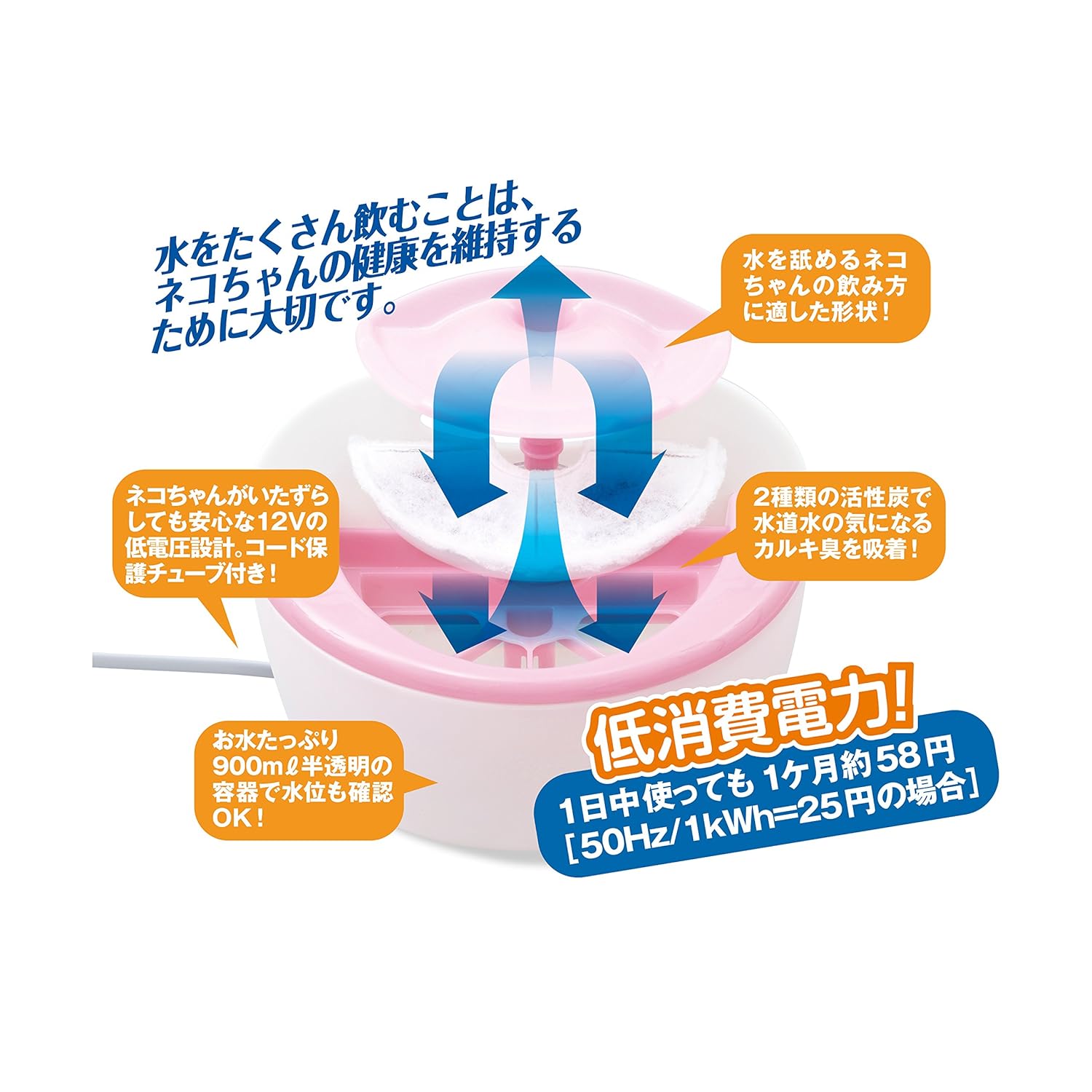 フィルターで水道水をろ過! きれいでおいしい水を作る循環式給水器。 サークル・ケージにしっかり固定できるので子猫でも安心! 流れる水が好きなねこちゃんの飲み方に合わせた舐めやすい新設計のトップファンネル(飲み口)を採用! フィルターで気になる食べカス、被毛、ホコリをフィルターでシャットアウトできるので、いつもたくさんきれいな水を与えられます。 フィルターでキャッチした汚れが水につからない構造なのできれいな水を維持! ポンプで水を循環させ、水中に酸素を取り込むので新鮮でおいしい水を維持できる! カートリッジ式なのでトップファンネルを外して入れ替えるだけの取り替え簡単! お水たっぷり容量900ミリリットル 低消費電力 1日中使っても電気代は1ヶ月約58円(50Hz/1kWh=25円の場合) 定格消費電力:3.2W/2.6W(50/60Hz) 電源コード:約2.0m(接続部含む)(コード保護チューブ:約50cm)