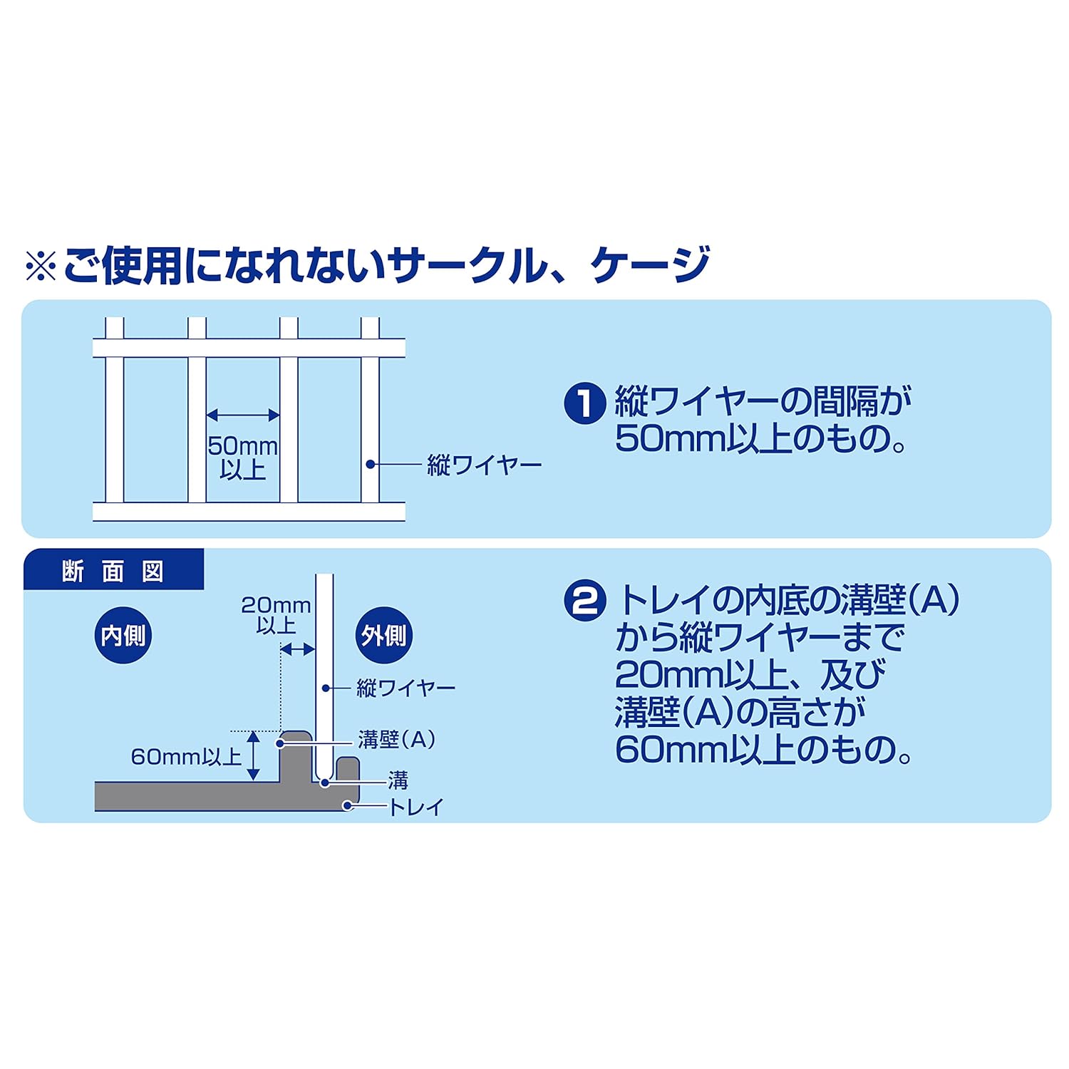 ※縦ワイヤーの間隔が50mm以上のもの、トレイのうち底の溝壁から縦ワイヤーまで20mmおよび溝壁の高さが60mm以上のサークル、ケージには使用できません。