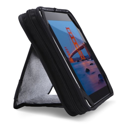 Whether working, being entertained or playing games, this hard shelled cover with in-case usability is perfect for all ages. Reinforced, Velcro kickstand keeps your tablet sturdy in multiple viewing angles, even from your lap or in bed. Thoughtfully designed reversible zippers allow you to open, then fold the case upon itself to re- zip into display position.
