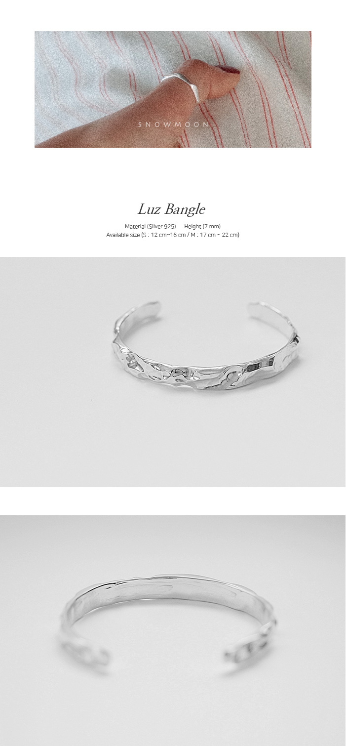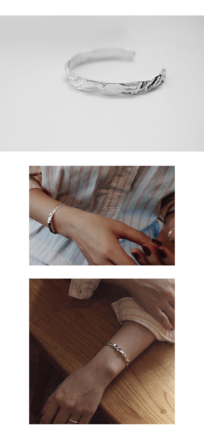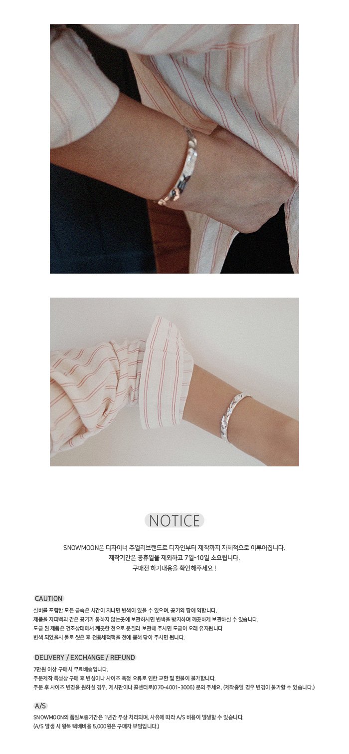 | #1 2017 1st collection #2 - Material : Silver 925 - Height : 7 mm - Available size : S (손목둘레 12 cm ~ 17 cm) / M (손목둘레 17 cm ~ 22 cm) #3 - 측정된 사이즈는 약간의 오차가 있을 수 있습니다. - 핸드메이드 제품 특성상 텍스처감과 형태감이 조금씩 상이할 수 있습니다. - 사이즈 조절 시 무리하게 힘을 가하면 제품 손상이 있을 수 있으니 유의 해 주세요. |
