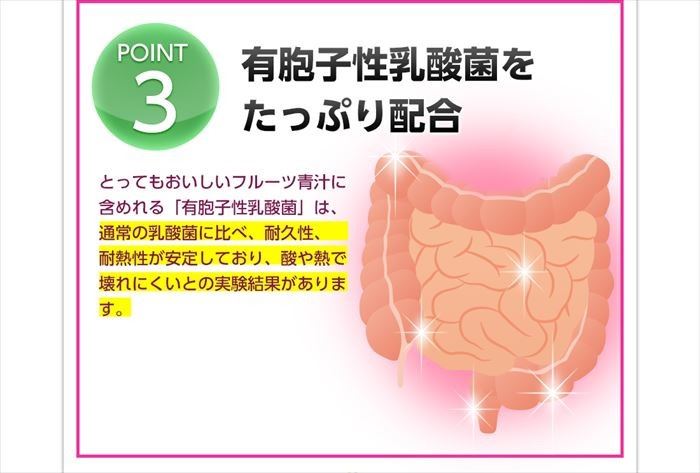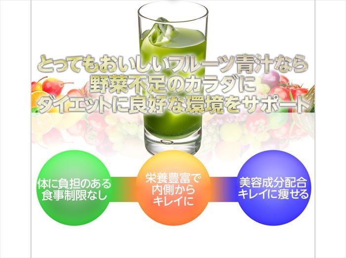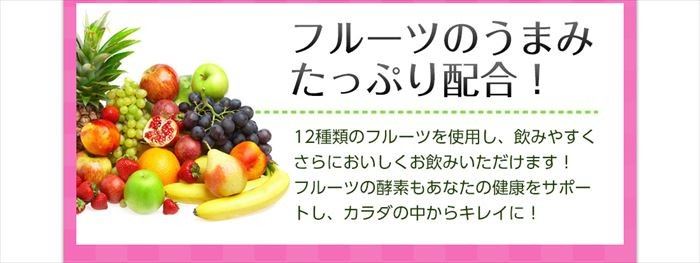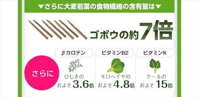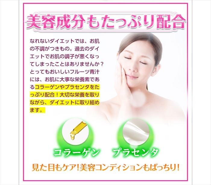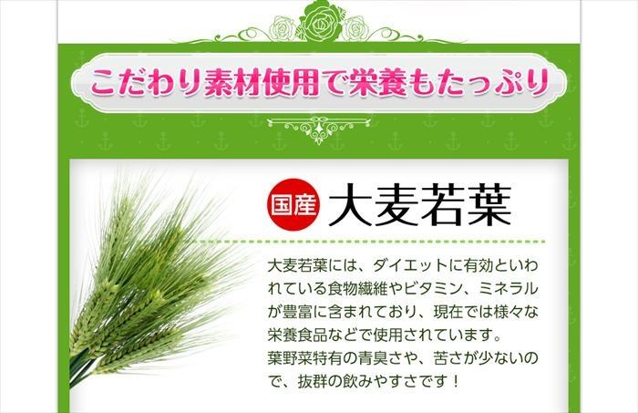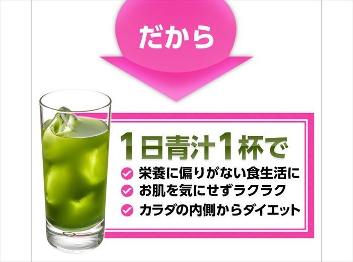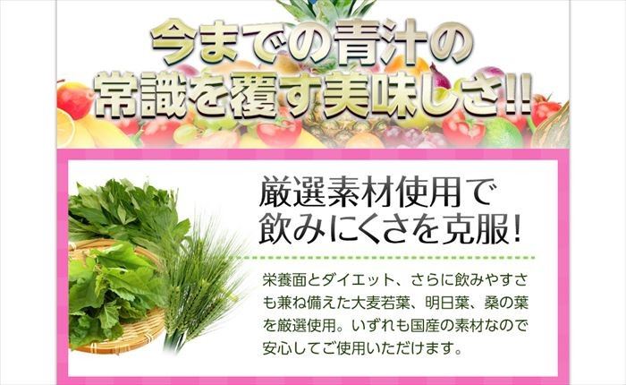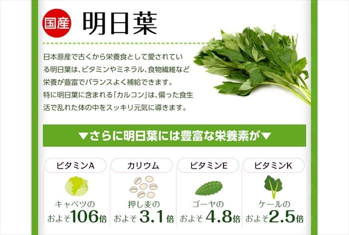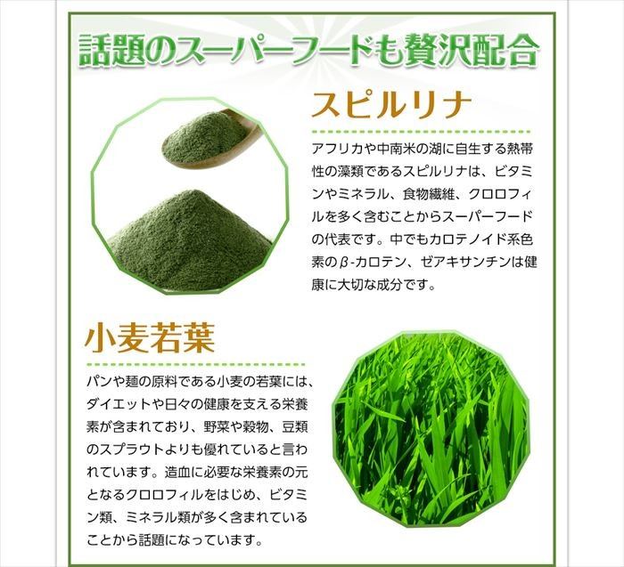 粉末還元麦芽糖水飴、大麦若葉末、デキストリン、クマザサ粉末、パイナップル果汁末、フィッシュコラーゲンペプチド、明日葉末、抹茶末、植物発酵抽出物、野菜・フルーツエキス末、緑茶抽出物、有胞子性乳酸菌、植物プラセンタ抽出物、パイナップル果実抽出物、乳糖、ボタンボウフウ末、桑の葉末、ケール末、ゴーヤ末、スピルリナ末、モロヘイヤ末、小麦若葉末、アロエベラ粉末/香料、甘味料(ネオテーム、スクラロース)、シクロデキストリン、ビタミンC、ナイアシン、ビタミンE、パントテン酸Ca、ビタミンB1、ビタミンB2、ビタミンB6、ビタミンA、葉酸、ビタミンD、ビタミンB12(原材料の一部に乳、小麦、オレンジ、りんご、キウイフルーツ、大豆、バナナ、カシューナッツ、ゴマ、ゼラチンを含む) |
