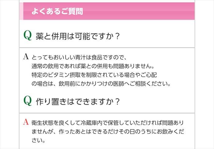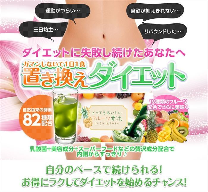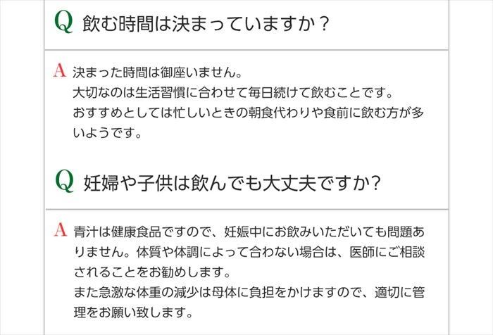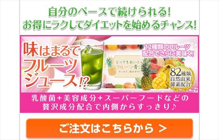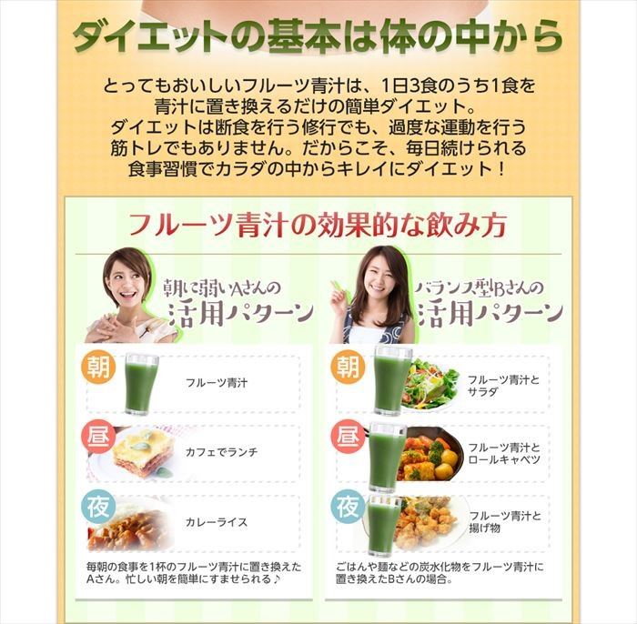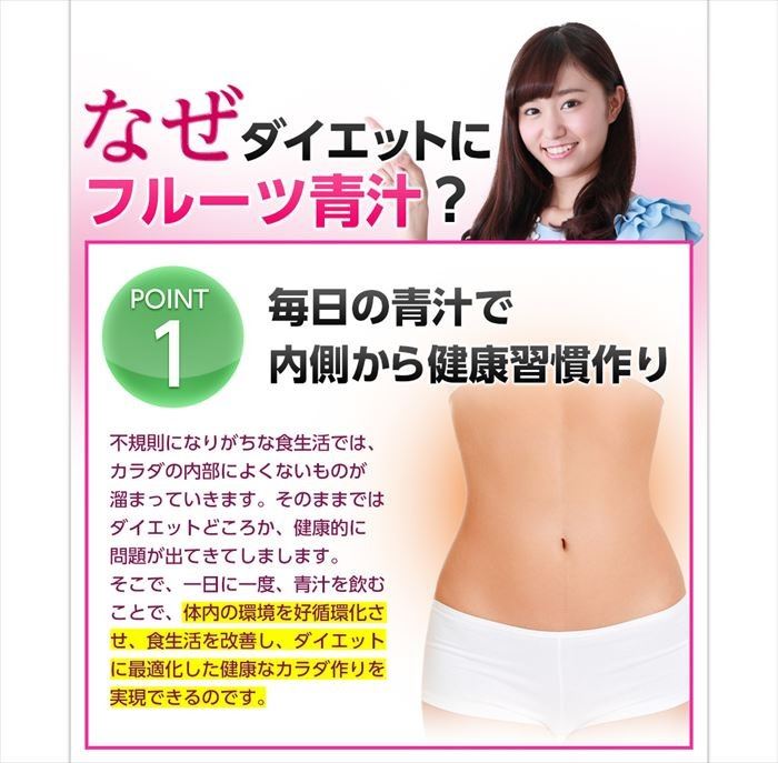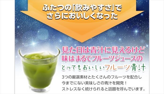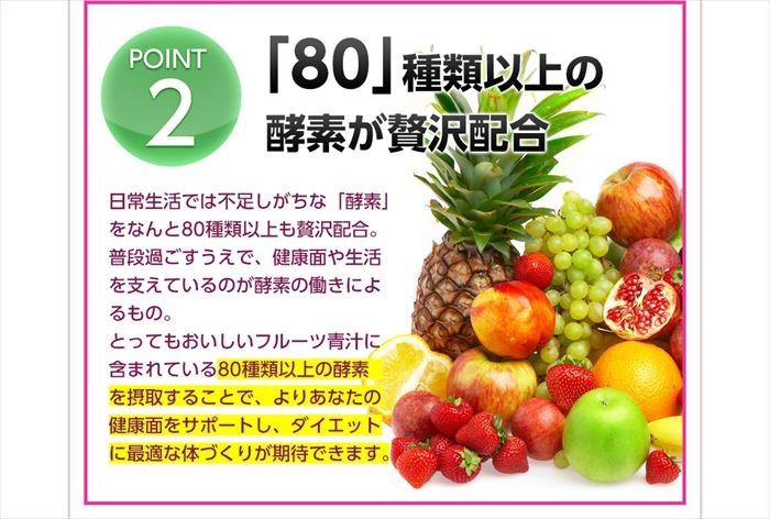 粉末還元麦芽糖水飴、大麦若葉末、デキストリン、クマザサ粉末、パイナップル果汁末、フィッシュコラーゲンペプチド、明日葉末、抹茶末、植物発酵抽出物、野菜・フルーツエキス末、緑茶抽出物、有胞子性乳酸菌、植物プラセンタ抽出物、パイナップル果実抽出物、乳糖、ボタンボウフウ末、桑の葉末、ケール末、ゴーヤ末、スピルリナ末、モロヘイヤ末、小麦若葉末、アロエベラ粉末/香料、甘味料(ネオテーム、スクラロース)、シクロデキストリン、ビタミンC、ナイアシン、ビタミンE、パントテン酸Ca、ビタミンB1、ビタミンB2、ビタミンB6、ビタミンA、葉酸、ビタミンD、ビタミンB12(原材料の一部に乳、小麦、オレンジ、りんご、キウイフルーツ、大豆、バナナ、カシューナッツ、ゴマ、ゼラチンを含む) |