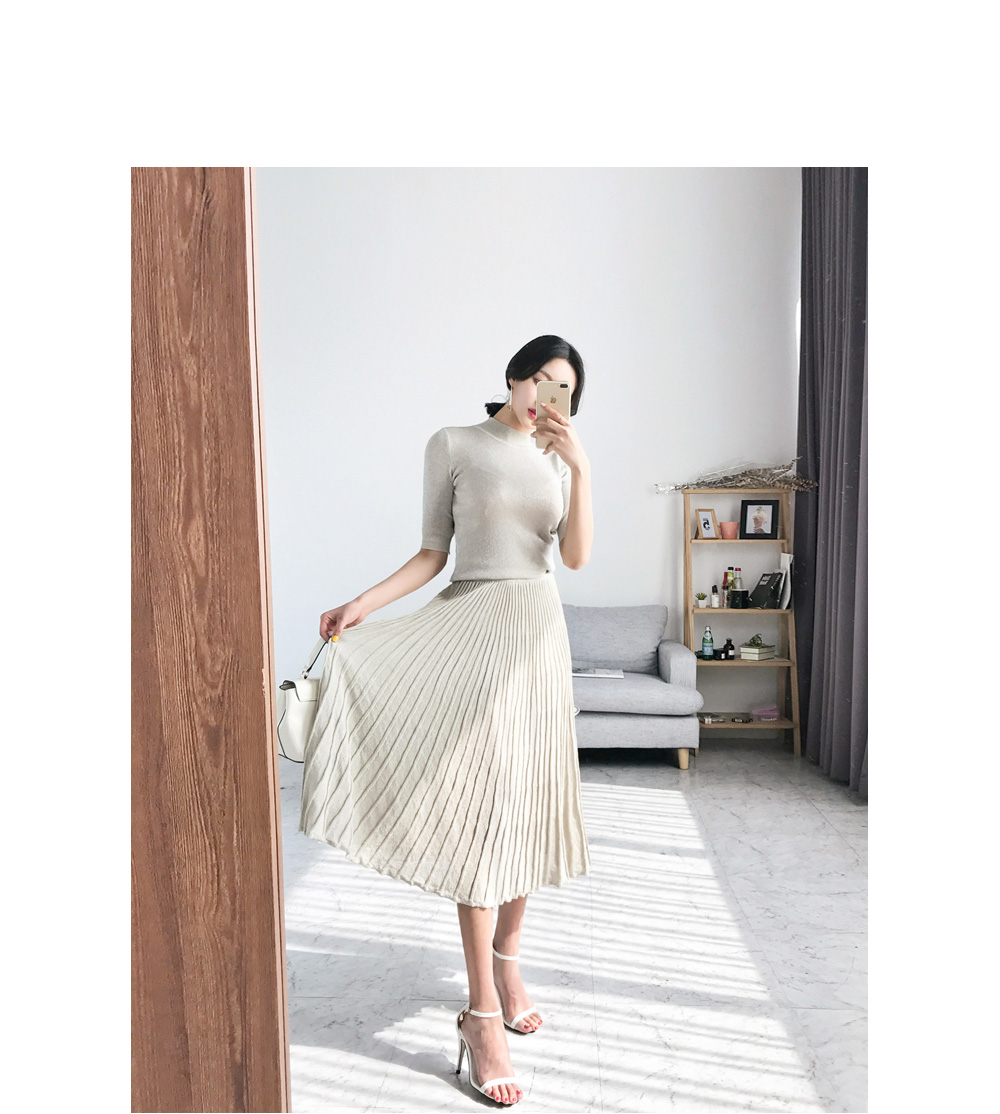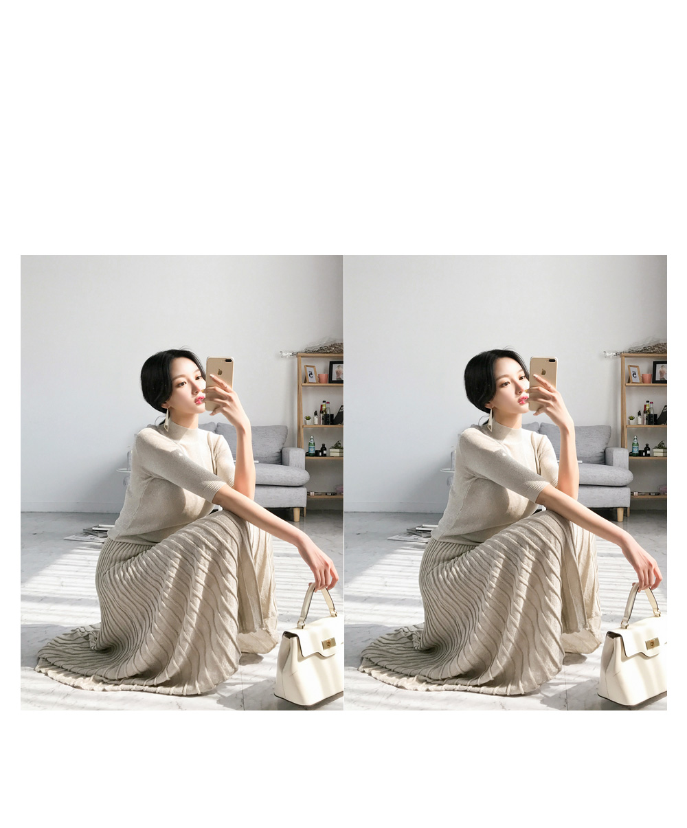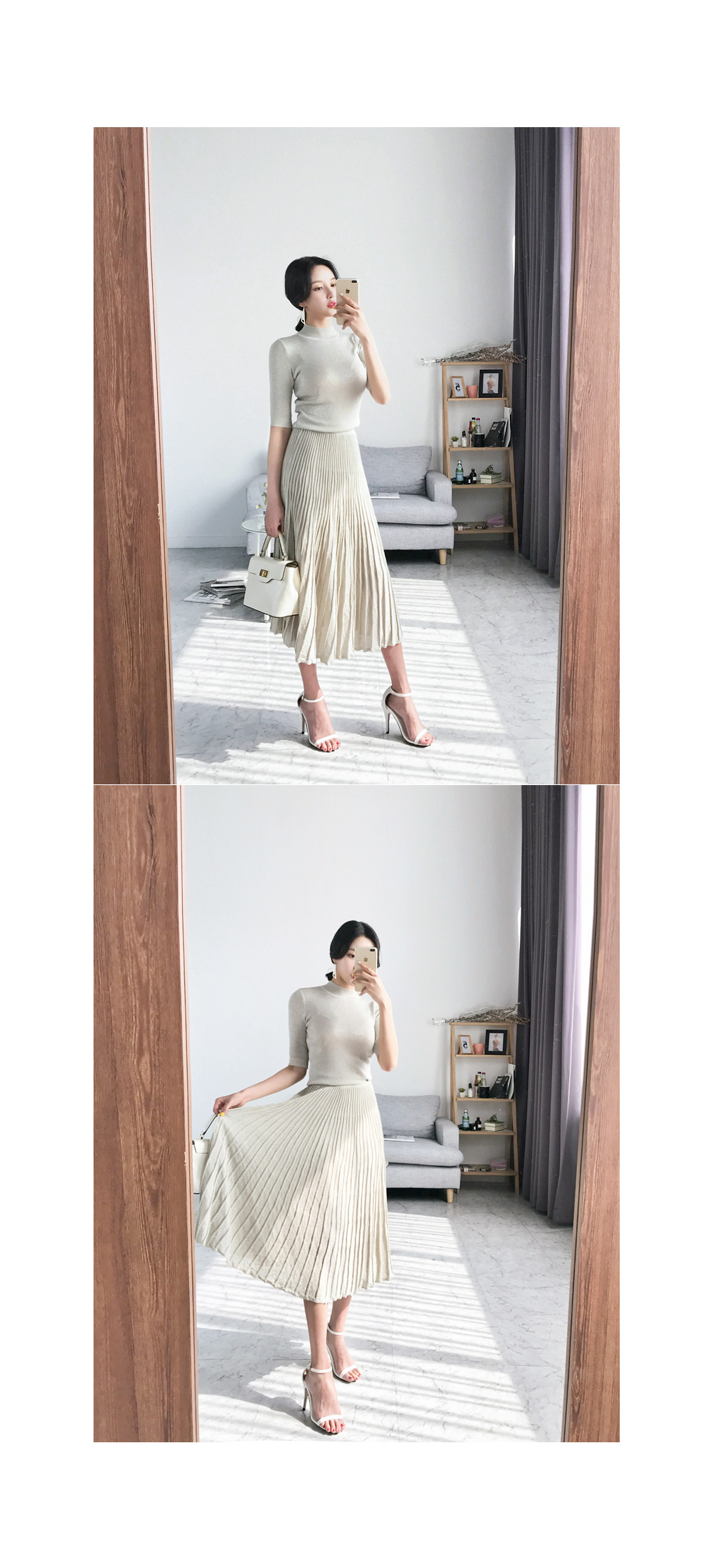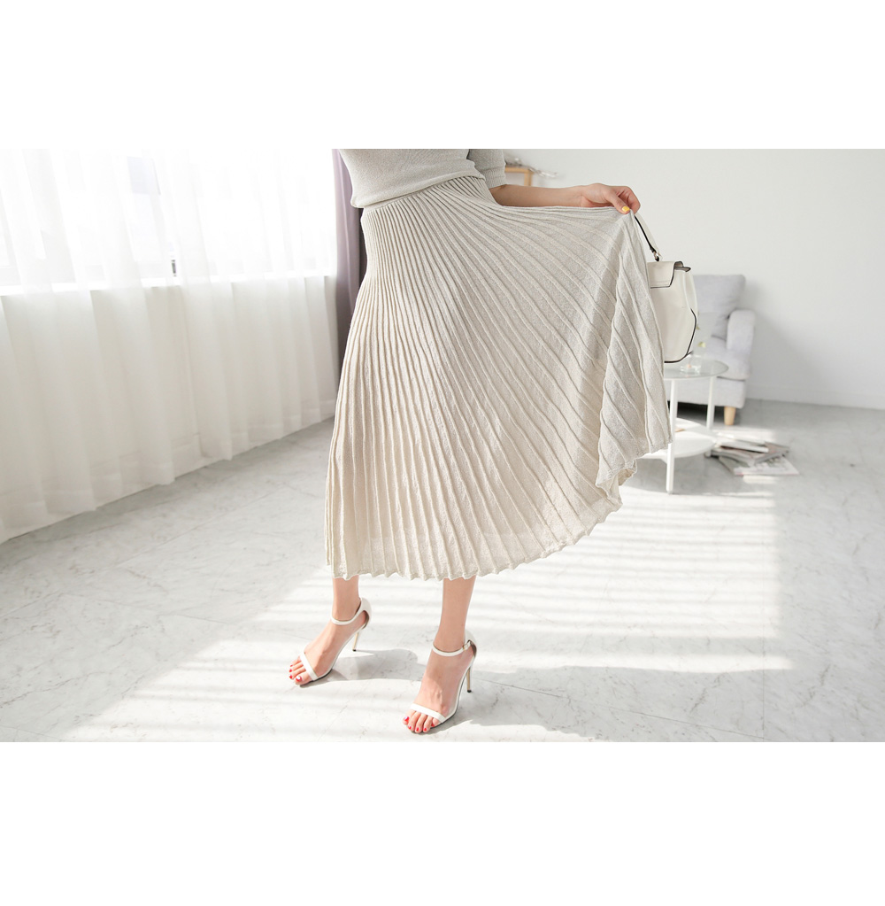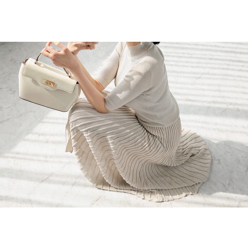 미니멀한 디자인의 니트탑과 롱 플리츠 스커트가