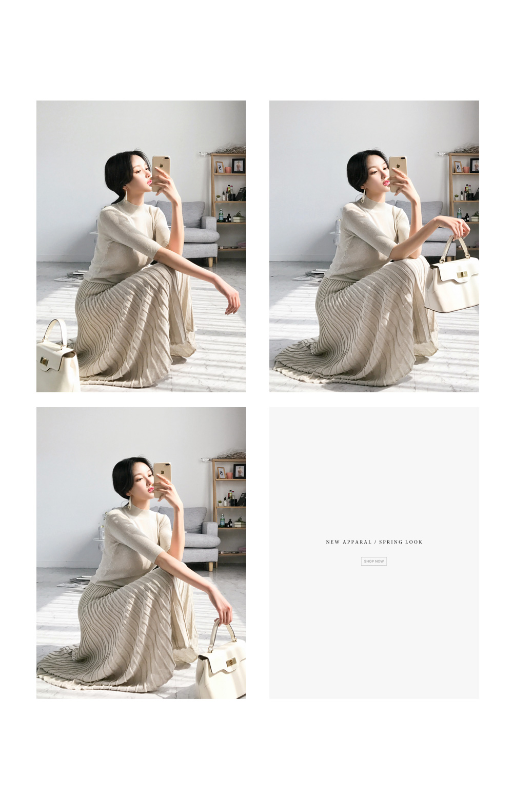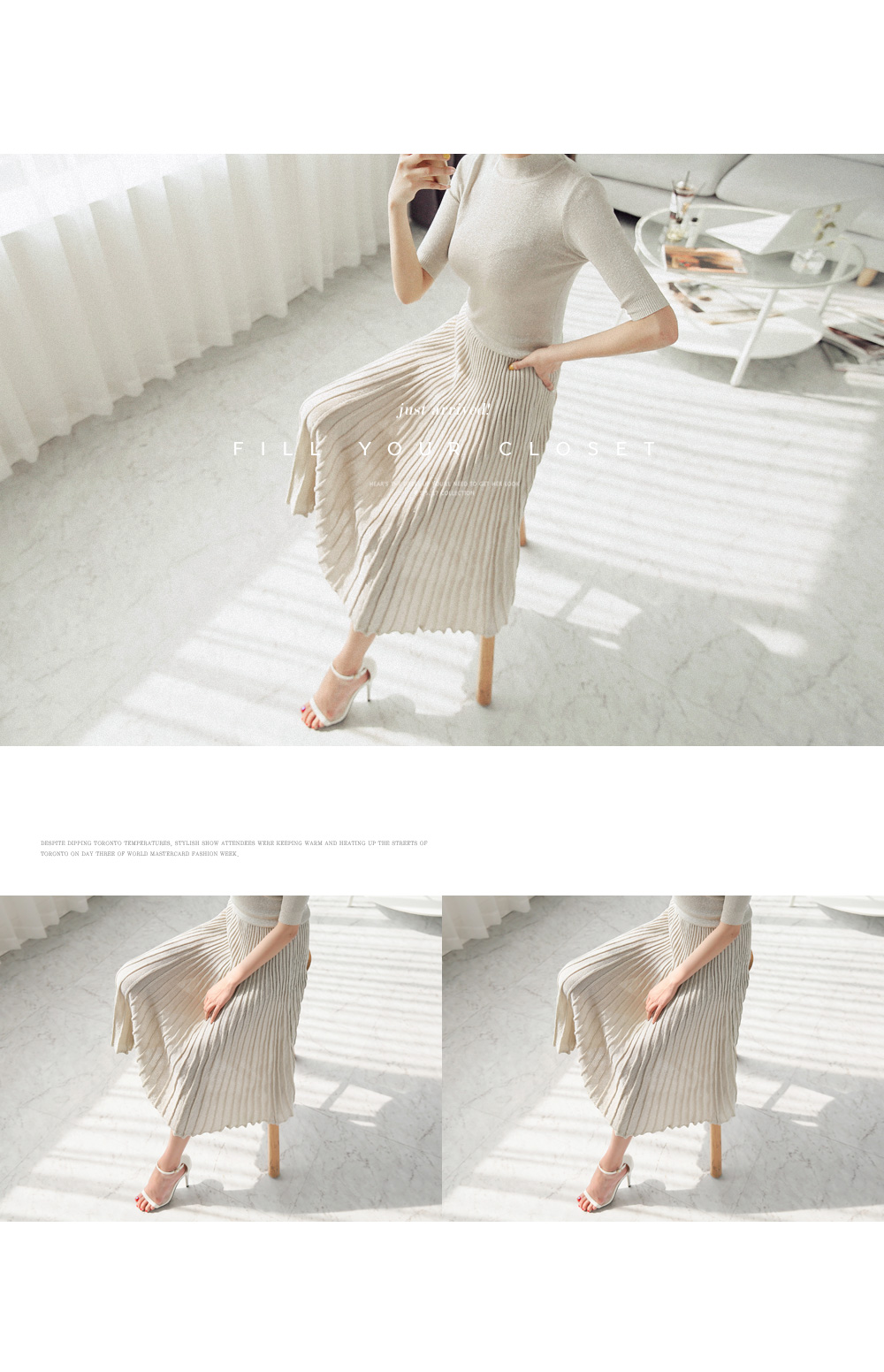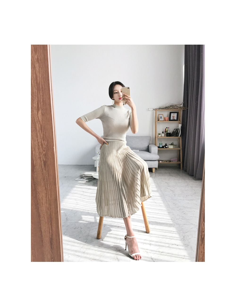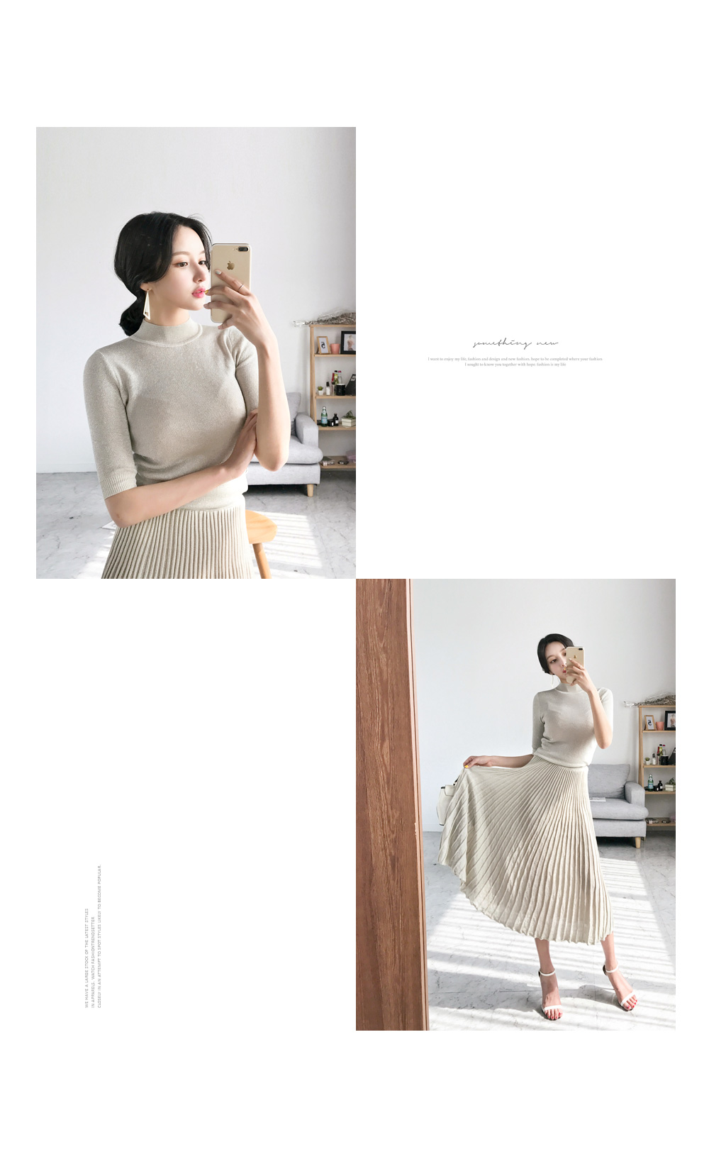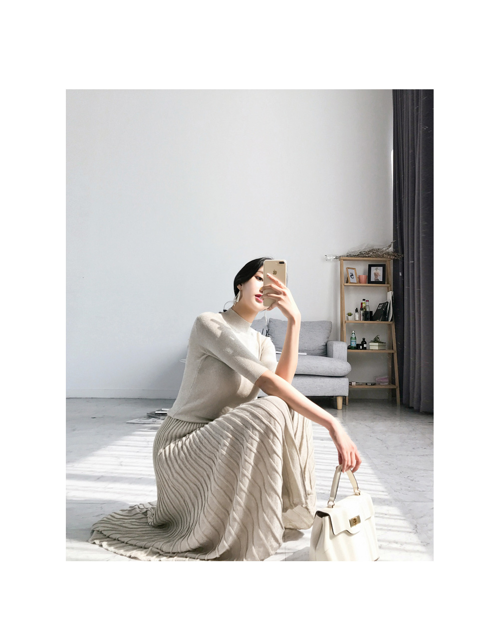 미니멀한 디자인의 니트탑과 롱 플리츠 스커트가