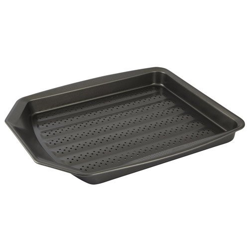 CHEFS French fry pan is in a larger size for family-size sides and entrees! Perforations enable heat to rise and circulate around French fries for all-over browning, without turning. Large nonstick French fry baking sheet custom-designed with 35% larger baking surface and 50% deeper well features convenient nonslip side handles. Ideal size to bake crispy chicken, fish, shrimp and larger quantities of French fries, onion rings or breaded hors d'oeuvres. Small pan bakes fries and appetizers for 1-3 servings. Ridges on the large and small nonstick French fry baking sheet elevate food, ensuring a deliciously light crispy texture, without the weight of cooking in oil. Heavy-gauge aluminized steel with Eclipse nonstick coating ensures easy release and cleanup! Bake frozen or freshly-prepared breaded appetizers, fish fillets, shrimp tempura, chicken tenders or wings. Nonstick French fry pan bakes healthy homemade potato chips or seasoned croutons. Easily roast vegetables, nuts or pumpkin or squash seeds without having to turn small pieces of food. Dark exterior absorbs heat for faster cooking times. Nonstick finish ensures quick release and easy cleanup. End chute slides food directly onto a platter for ease in serving. Wide rolled rim and nonslip nodular grips for safe transport. PFOA- and PTFE-free. Oven safe to 450 F. Hand wash. CHEFS signature collection of professional-quality cookware, kitchen tools, bakeware, dinnerware and more is meticulously crafted and tested to delight the most discerning cook. CHEFS commitment to innovative, functional design is the key to delivering products of exceptional quality, performance and durability for home and professional kitchens.
