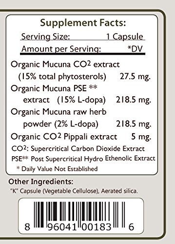 -. Feature : Potent Supercritical Co2 extract of 15% Mucuna phytosterols (fat soluble component) and Mucuna PSE extract 15% L-Dopa (water soluble component) / Extracted using Super Compressed Carbon Dioxide (CO2) powerful, pure, and completely bio-available / Recognized as an aphrodisiac in Ayurveda / Grown on organic farms with no chemicals, pesticides or herbicides / 100% vegetarian Vcaps made with Certified Organic ingredients
