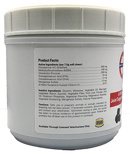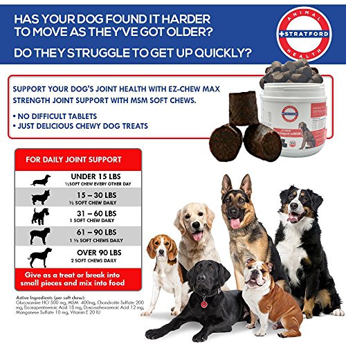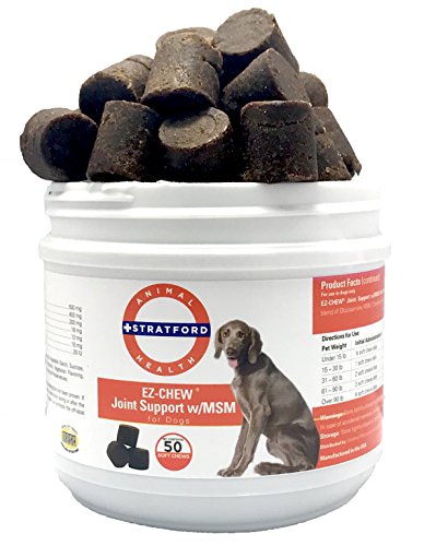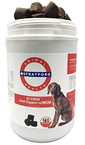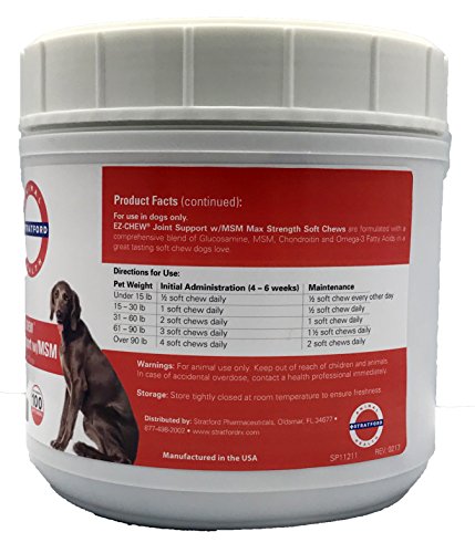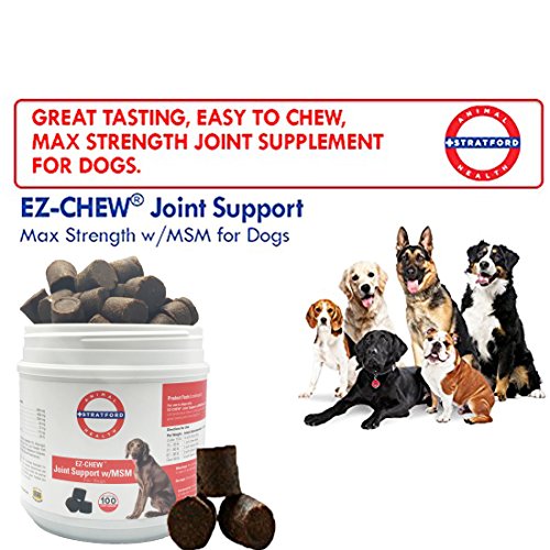 Stratford Pharmaceuticals EZ-CHEW Joint Support with MSM Max Strength Soft Chews are formulated with a comprehensive blend of Glucosamine, MSM, Perna Canaliculus Chondroitin and Omega-3 Fatty Acids in a great tasting soft chew dogs love! Patented sealed matrix protects the ingredients until digested. Additional Information: Glucosamine HCl is a major building block of cartilage. It also makes up to 50 percent of the natural lubricant found in synovial fluid. By supplementing naturally present Glucosamine, the body is able to facilitate the manufacture and maintenance of cartilage, and helps restore lubricant in the synovial fluid. Synovial fluid then regains the ability to carry nutrients to rebuild cartilage, insulate bones from friction and cushion the joint. Chondroitin Sulfate is important for healthy joints. It is one of the components of the tissue that covers the surfaces of the bones in your dogs joints (i.e., knee, elbow, hip), called articular cartilage. It helps make up a portion of the tissue covering the bones giving cartilage elasticity, enhancing its shock-absorbing properties. MSM is a natural anti-inflammatory, noted for its exceptionally non-toxic nature. MSM supplies dietary sulfur necessary for collagen production, which helps form bones, tendons and connective tissue. Ingredients: Glucosamine HCl - 500 mg, MSM - 400mg, Chondroitin Sulfate - 200 mg, Eicosapentaenoic Acid - 18 mg, Doscosahexaenoic Acid - 12 mg, Manganese Sulfate - 10 mg, & Vitamin E - 20 IUFeature