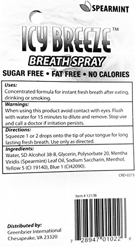 Studio : Icy Breeze Publisher : Icy Breeze Binding : Health and Beauty Product Description Icy Breeze Breath Spray Instant Fresh Breath: Spearmint, Sugar Free, Fat Free, No Calories, .3 fl. oz (8.5ml) Uses: Concentrated formula for instant fresh breath after eating, drinking or smoking. Lightweight, small size easily fits in pockets, purses, bags, glove compartments, dash trays, etc. Warnings: When using this product avoid contact with eyes. Flush with water for 15 minutes to dilute and remove. Stop use and call a doctor if irritation persists. Directions: Spray 1 or 2 times into mouth for long lasting fresh breath. Use only as directed. Ingredients: SD Alcohol 38-B, Glycerin, Polysorbate 20, Mentha Viridis (Spearmint) Leaf Oil, Sodium Saccharin, Menthol, Yellow 5 (CI 19140), Blue 1 (CI2090). 0