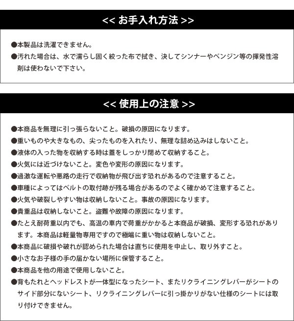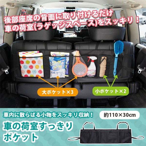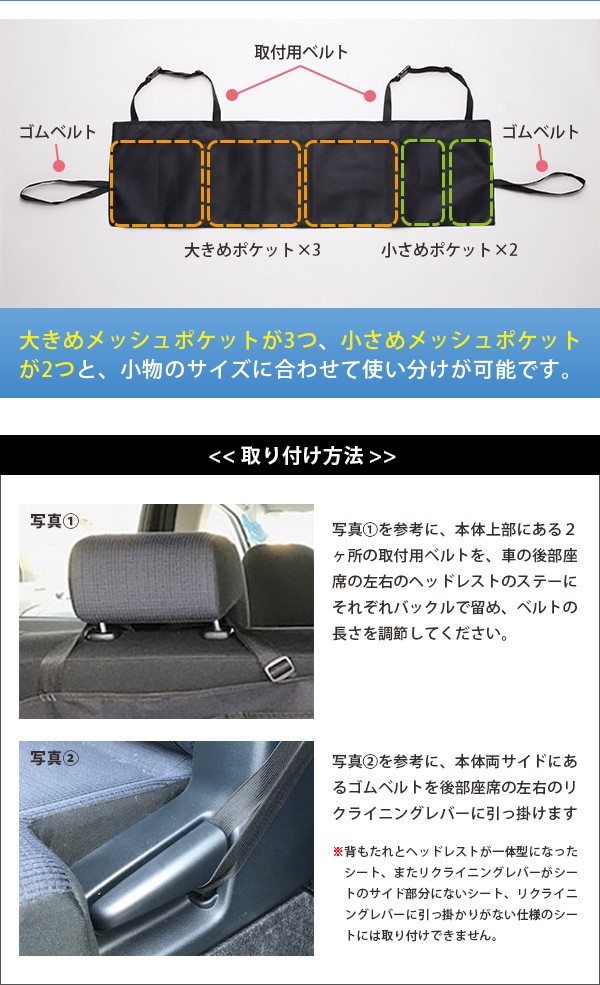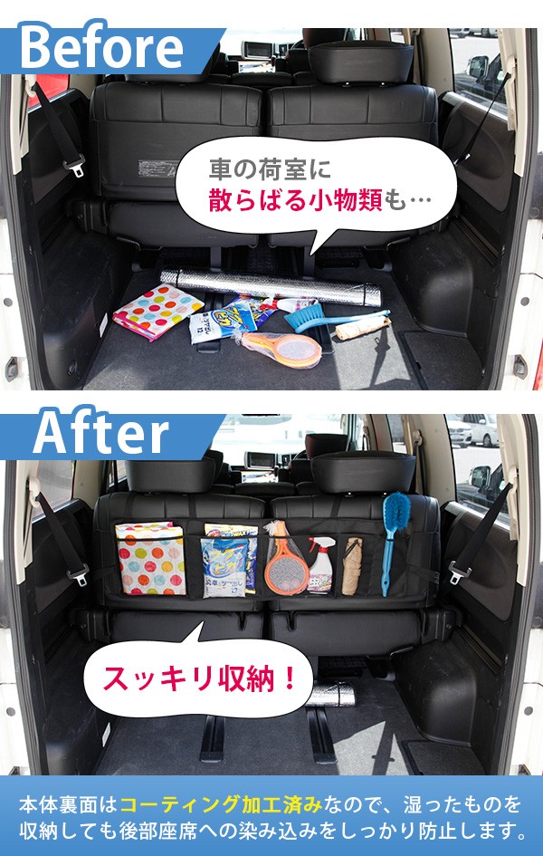 | 後部座席の背面に取り付けるだけで、車の荷室(ラゲッジスペース)の小物をすっきり収納します。3つの大きめメッシュポケットと2つの小さめメッシュポケットで小物に合わせて使い分けが可能。裏面コーティングで、湿った物を収納した際、後部座席への染み込みを防ぎます。ラゲッジスペース床の小物を後部座席の後ろに収納してしまえば、荷室が効率よく広々と使えます。 |