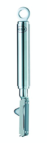 Amazon.com One of Rosle's superb kitchen tools, this 7-1/2-inch fruit and vegetable peeler has a swivel blade for easily peeling fruits and vegetables and is designed for right-handers who peel toward their bodies. (Right-handers who customarily peel away from their bodies should use Rosle's left-handed swivel peeler.) Opposite the blade is a point sharpened on both sides to remove potato eyes and other blemishes. Like all Rosle tools, utensils, and Open Kitchen storage components, this peeler is made of 18/10 stainless steel for rustproof beauty and long-lasting durability. The round handle has a satin finish to conceal finger marks. The handle is sealed against water and has a hanging ring so it can be conveniently stored on a hook in the Open Kitchen system of Rosle basic rails and Gridwalls or hung on any hook or peg. The peeler is sturdy, balanced, and exceptionally comfortable in the hand. All Rosle products are dishwasher-safe, and carry a lifetime warranty against defects. --Fred Brack 0