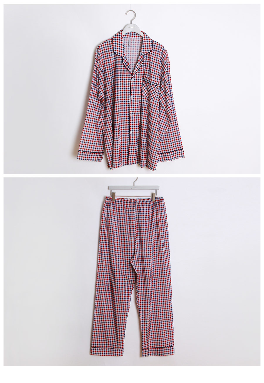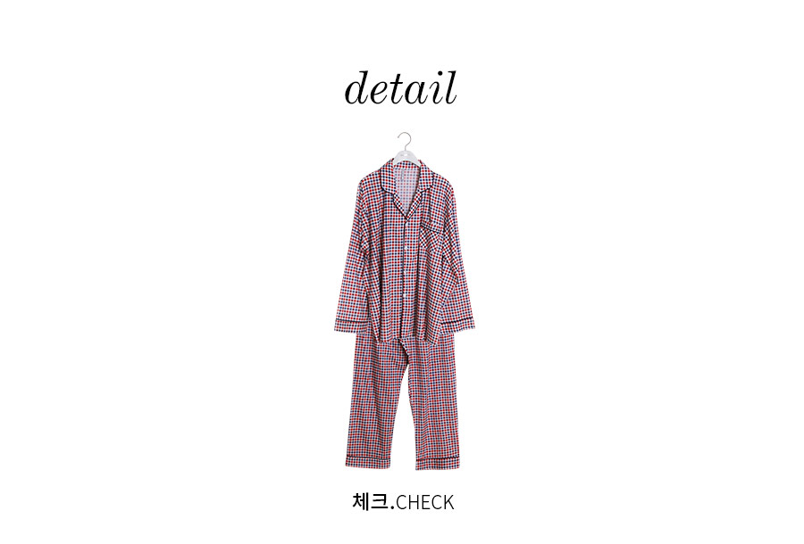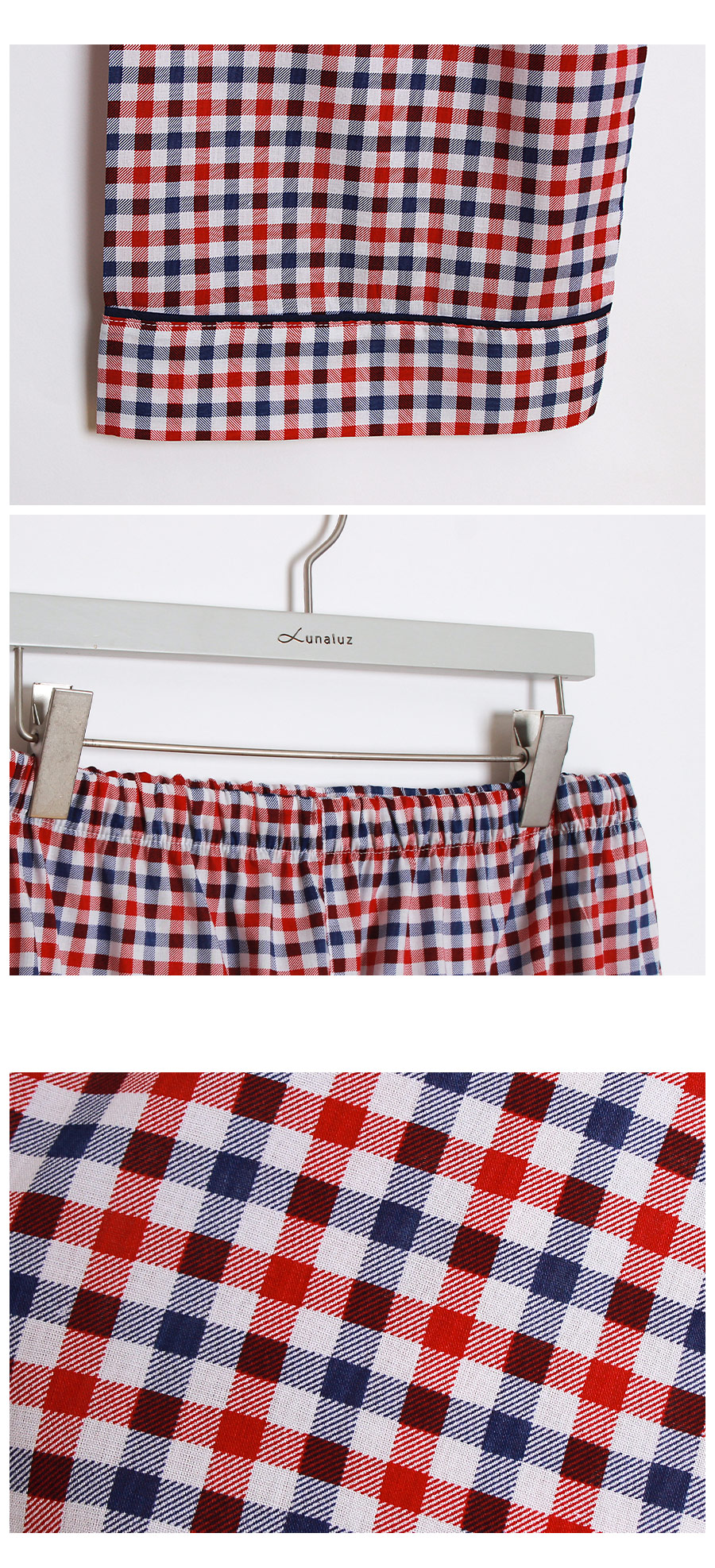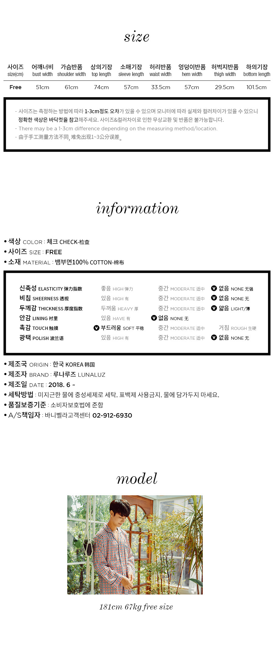 통기성, 땀 흡수력, 향취, 향균이 굉장히 우수한 대나무섬유로 제작한 잠옷세트에요. 소재에서부터 벌써 매력이 느껴지는 프리미엄 잠옷이랍니다. 매끈하고 고급스러운 윤기가 나는 소재의 잠옷으로 면(cotton)보다 부드럽고, 내구성이 강하며 통기성이 우수합니다. 백화점에서 구입하시면 고가의 프리미엄 잠옷입니다. 가정에서 물세탁까지 가능한 소재로 소재의 내구성, 퀄리티에서 꼭!!! 구입하셨음 좋겠어요:) 경쾌하고 young해보이는 컬러 조합의 체크 패턴으로 집 안의 분위기를 한 층 더 up시켜줄 파자마세트입니다. DETAIL 포켓 카라 스타일의 파자마 디자인으로 카라의 끝 부분과 클로징부분 마감과 손목과 팬츠 하단에 네이비 컬러 파이핑을 둘러 포인트를 주었습니다. 한 번 쟁여놓으면 게속해서 손이 갈 기본스타일의 잠옷입니다, 소재, 컬러, 디자인까지 세심하게 작업한 잠옷으로 강력 추천해요. 소재에서부터 충분한 소장가치가 있는 잠옷으로 선물은 물론이고 개인 소장으로도 꼭! 구매하셨음 좋겠어요:) 100%국내 제작으로 소재, 디자인, 봉제의 퀄리티가 높습니다. SIZE 평균 100size에게 적합한 free사이즈 입니다.
